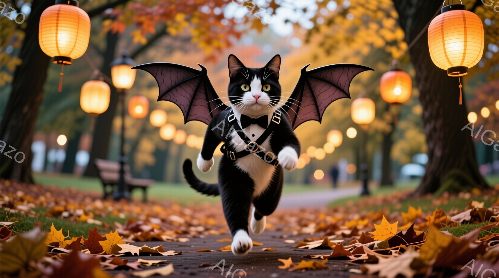 白と黒の猫が、ハロウィーンを連想させるバットの翼と蝶ネクタイ、ハーネスを身につけ、秋の落ち葉が散らばる道を駆けている。背景にはぼやけた木々と、暖かい光を放つ提灯が並び、秋の夜の幻想的な雰囲気を醸し出している。猫の表情は真剣で、どこか楽しげであり、躍動感に満ちたシーンである。