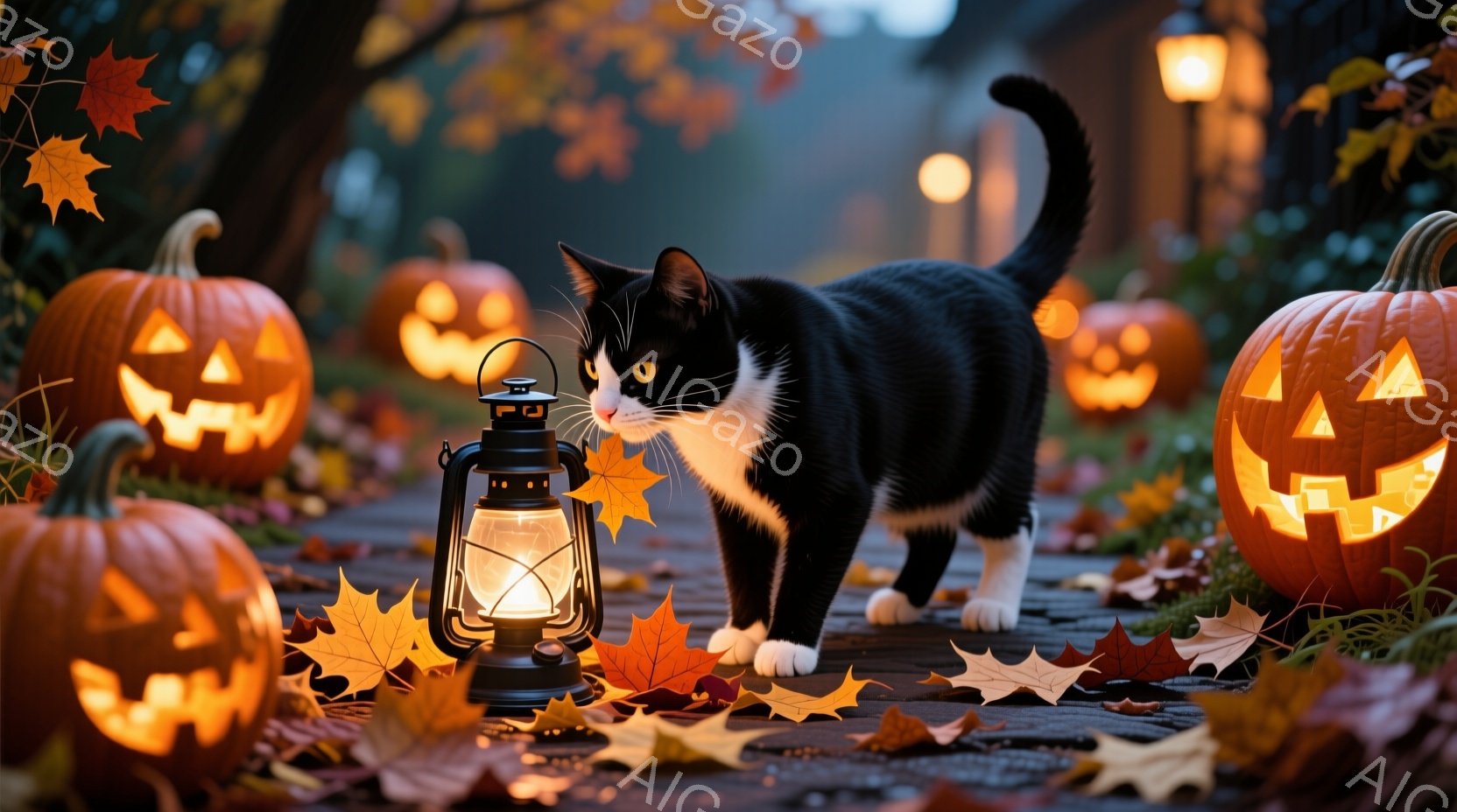 白と黒の猫が、ハロウィーンの飾り付けがされた庭の小道の中央を歩いている。背景には、ジャック・オー・ランタンが灯り、落ち葉が散らばり、遠くにぼんやりと家が見える。暖かく幻想的な雰囲気で、秋のハロウィーンの夜を思わせる。
