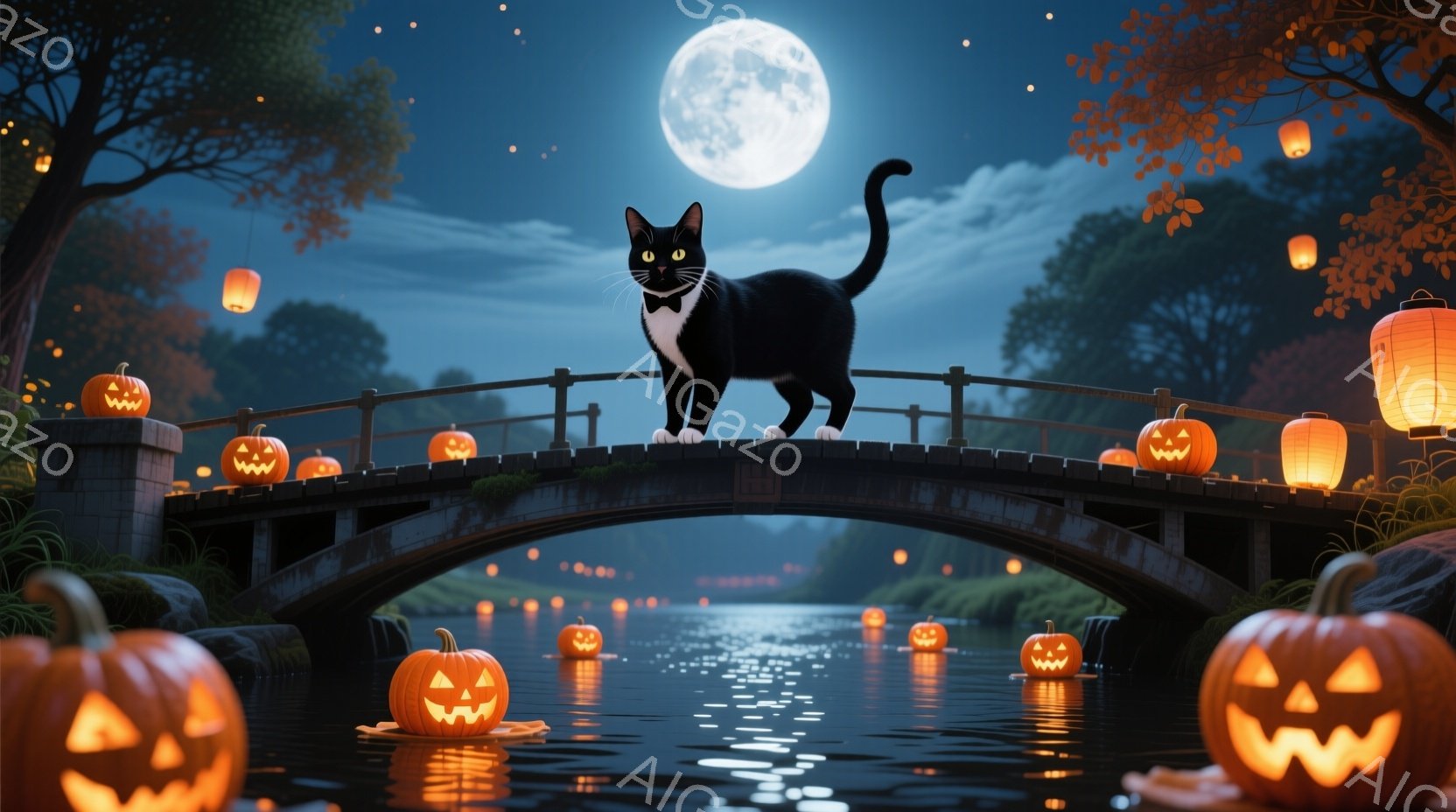白と黒の猫が、ハロウィーンカボチャが浮かぶ池に架かるアーチ橋の上で、後ろ足を揃えて立っている。満月が夜空を照らし、水面にはカボチャの光と街灯の反射が揺らめき、秋の夜の神秘的な雰囲気を醸し出している。背景には暗い木々が見え、全体的に幻想的で少し不気味なハロウィーンの夜の情景が描かれている。