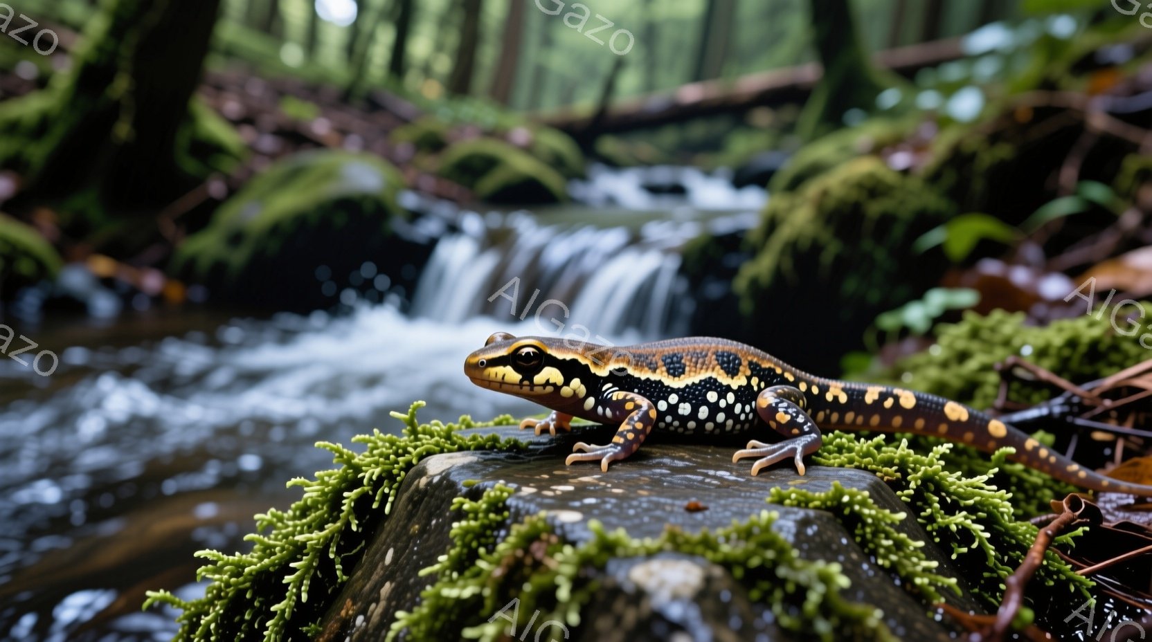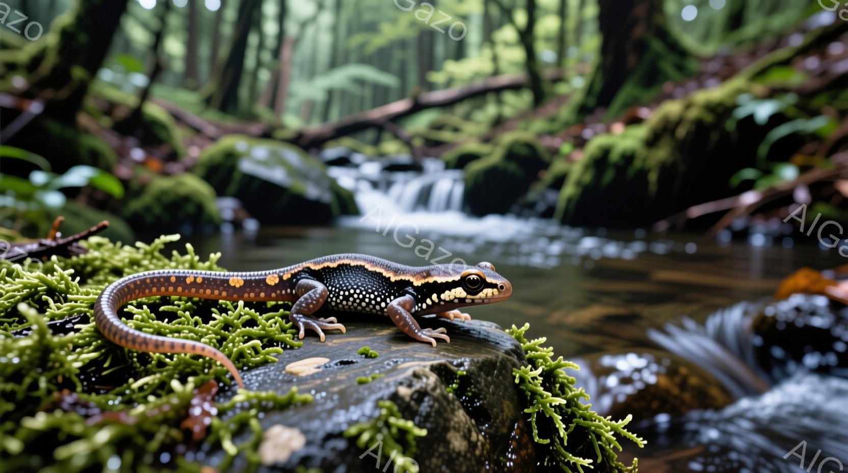 岩の上に鮮やかなオレンジと黒の模様をしたサンショウウオが佇んでいます。背景には水が流れる小川と緑豊かなコケが生い茂る岩場が広がり、湿った自然の雰囲気が漂っています。光の当たり具合で、サンショウウオの皮膚がわずかに光沢を帯び、生き生きとした様子が伝わってきます。