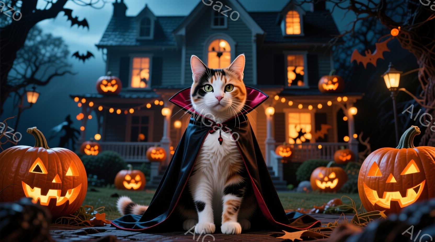 この無料AI生成画像「オレンジ色の背景に、骨柄の衣装を着た二匹の猫が並んで座っています。片方の猫は白と茶色の毛並みで、もう片方は白と黒の毛並みで、どちらも少し驚いたような表情をしています。背景にはハロウィンのカボチャやコウモリのぬいぐるみがあり、全体的に楽しいハロウィンの雰囲気が漂っています。」は、2025年10月25日に作成されました。 サイズは 1664×928px の高解像度で、商用利用も可能なフリー素材として提供しています。