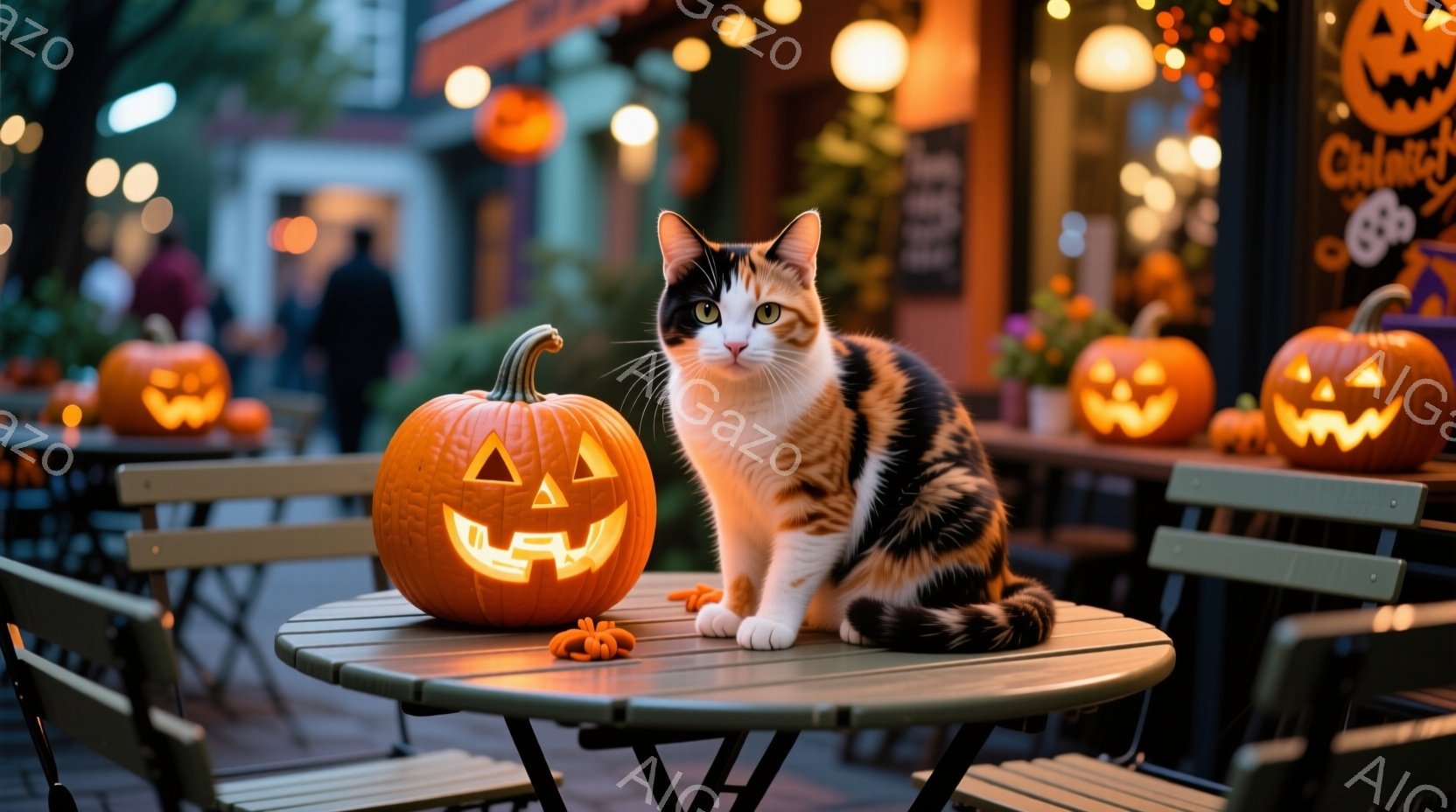 白とオレンジ色のまだら模様の猫が、ハロウィーンの装飾がされたカフェのテーブルに座っています。テーブルの上には、点灯したジャック・オー・ランタンが2つ置かれ、背景にはさらに多くのカボチャの装飾がカフェの窓や通りに飾られています。夜間であるにも関わらず、カフェからの暖かい光とカボチャのオレンジ色が、秋のハロウィーンの心地よい雰囲気を醸し出しています。