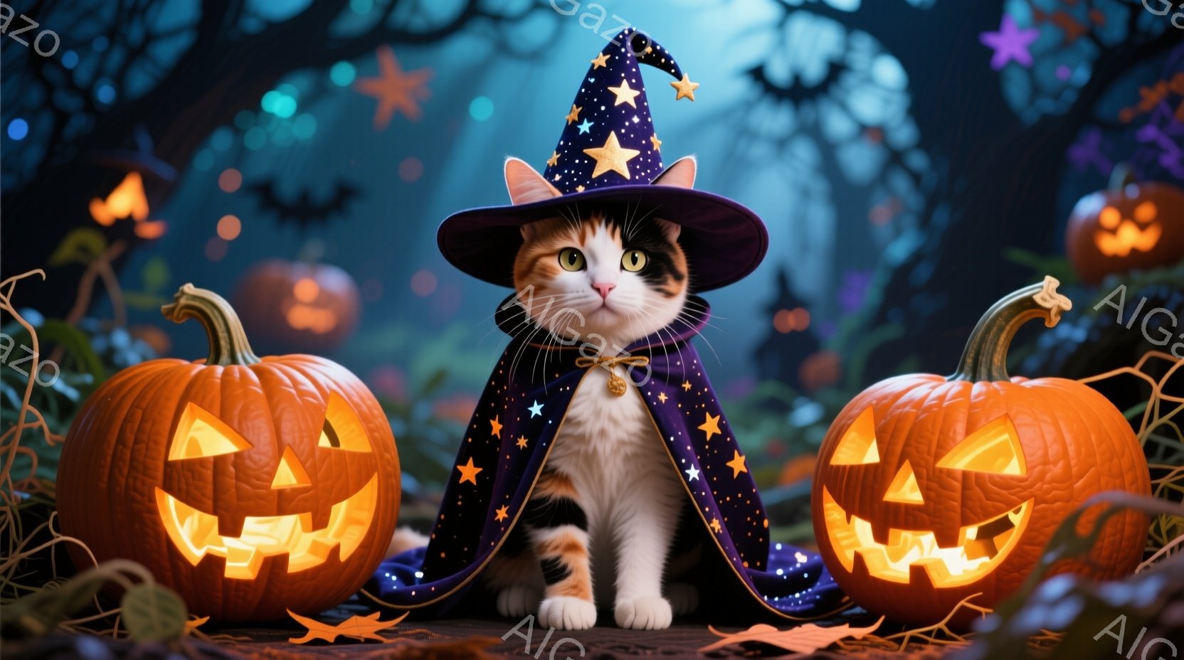 白と茶色の猫が、星が散りばめられた黒い魔法使いの帽子とマントを身につけて座っています。左右にはジャック・オー・ランタンが配置され、暗い森の中でほのかな光を放っています。全体的にハロウィーンの夜の神秘的で楽しい雰囲気が漂っています。