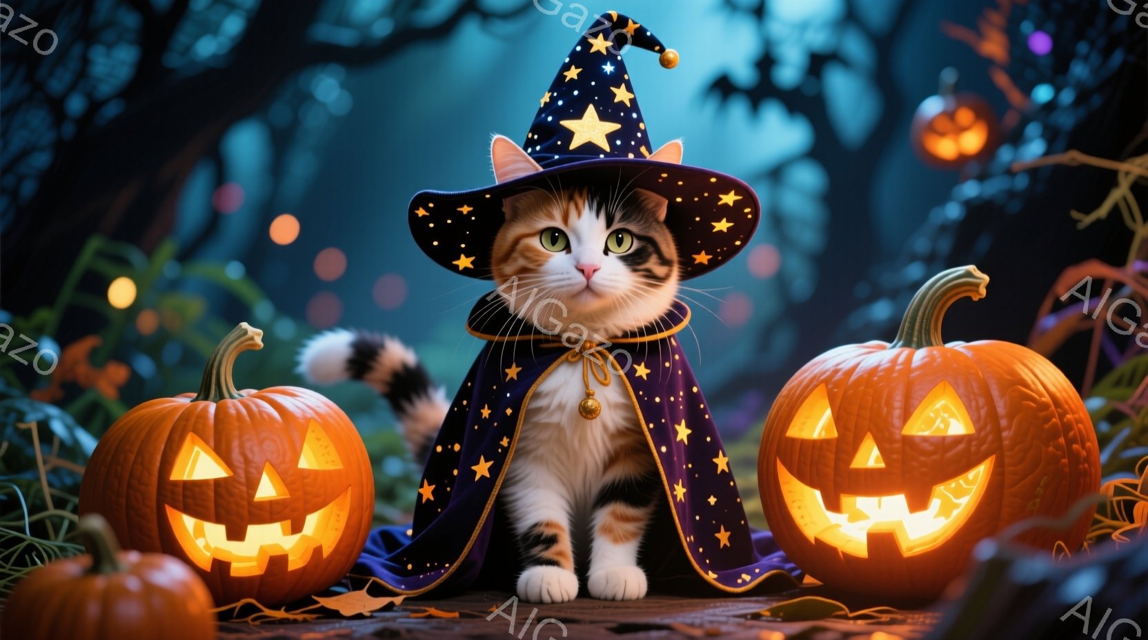 白と茶色の模様の猫が、星が散りばめられた黒い魔法使いの衣装と帽子を身につけて座っている。その猫は正面を見つめており、表情は穏やかで可愛らしい。背景には、光るジャック・オー・ランタンと、暗い森のシルエットが見え、ハロウィーンの雰囲気満載の夜の光景が描かれている。