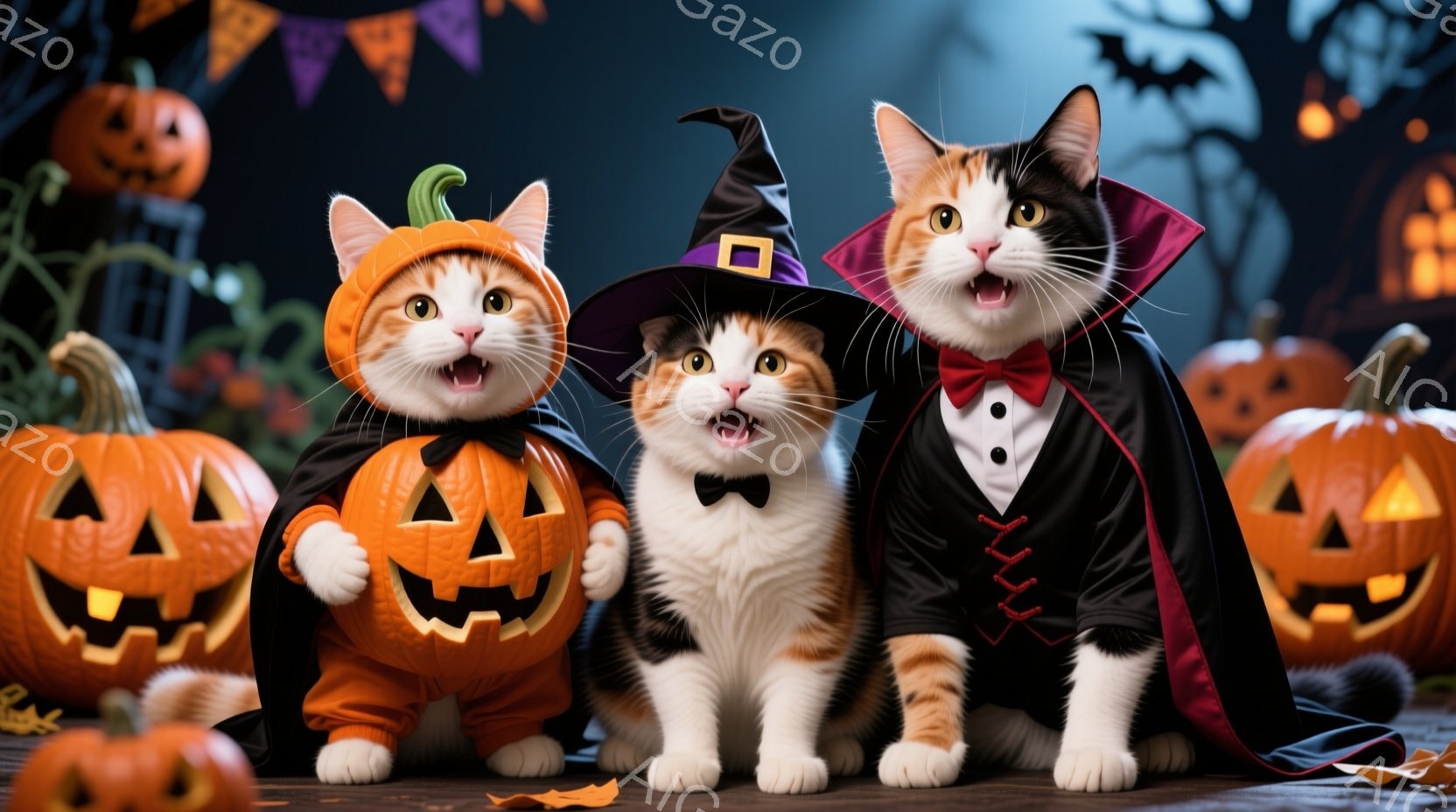 ハロウィーンをテーマにした猫たちが、彫刻されたカボチャに囲まれて座っています。中央の猫は魔女の帽子をかぶり、両側の猫はそれぞれカボチャの衣装とドラキュラの衣装を着ています。背景にはハロウィーンの装飾が施され、全体的に明るく楽しいお祝いの雰囲気です。