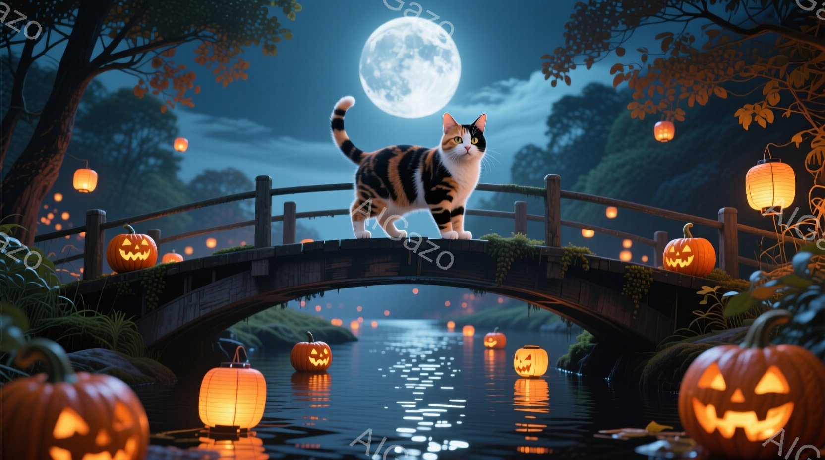 満月が輝く夜、小さな木製の橋の上に三毛猫が立っている。橋の欄干にはいくつものジャック・オー・ランタンが並び、水面には光が反射して幻想的な雰囲気を醸し出している。周囲は緑豊かな植物に囲まれ、ハロウィンの夜らしい、どこか神秘的で温かい光景である。