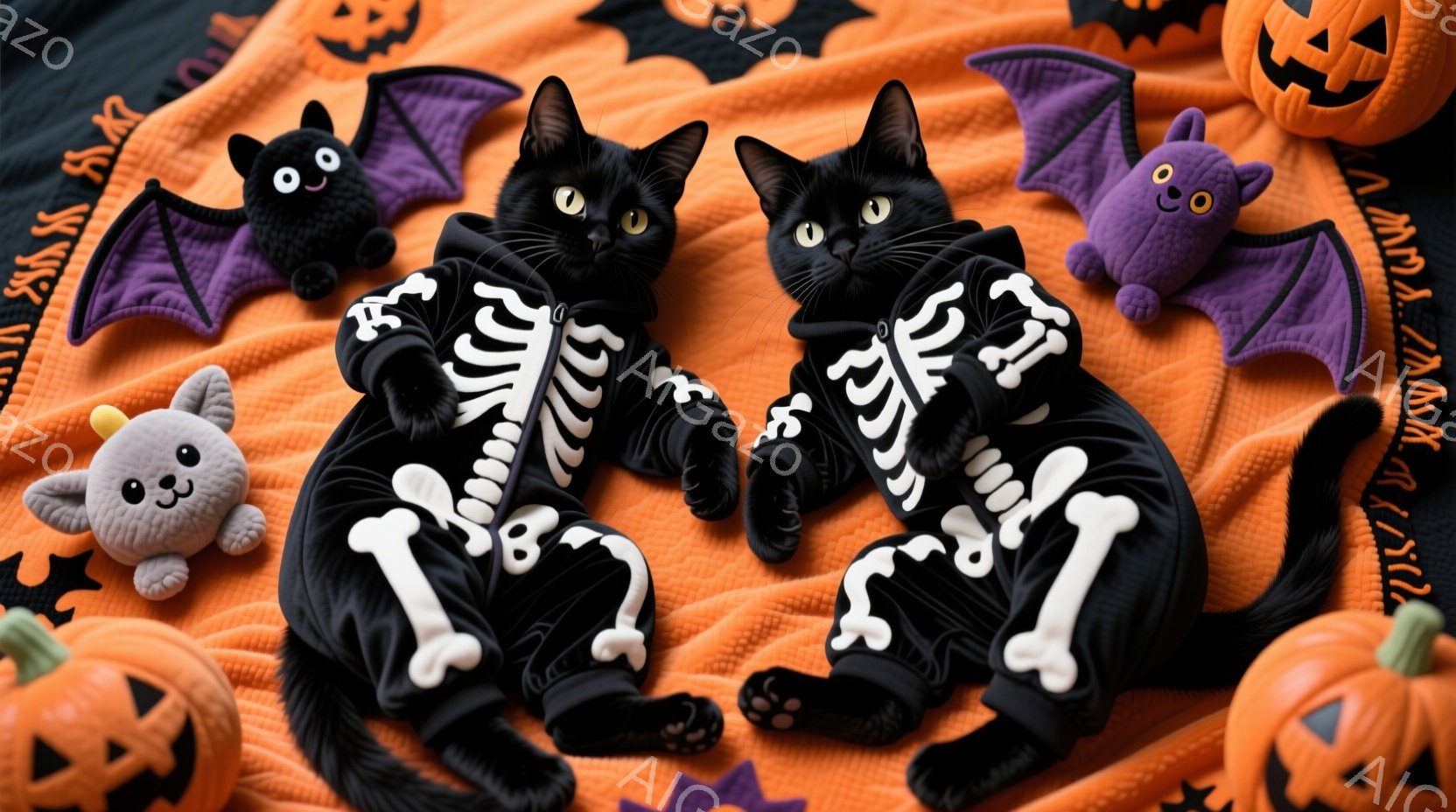 黒猫がハロウィーンの衣装を着て、オレンジ色のキルトの上に並んで座っています。衣装は骨の形をしたデザインが特徴で、猫たちはリラックスした表情で、お互いに寄り添っています。背景には、かぼちゃやお化けのぬいぐるみがあり、全体的に賑やかで楽しいハロウィーンの雰囲気を醸し出しています。