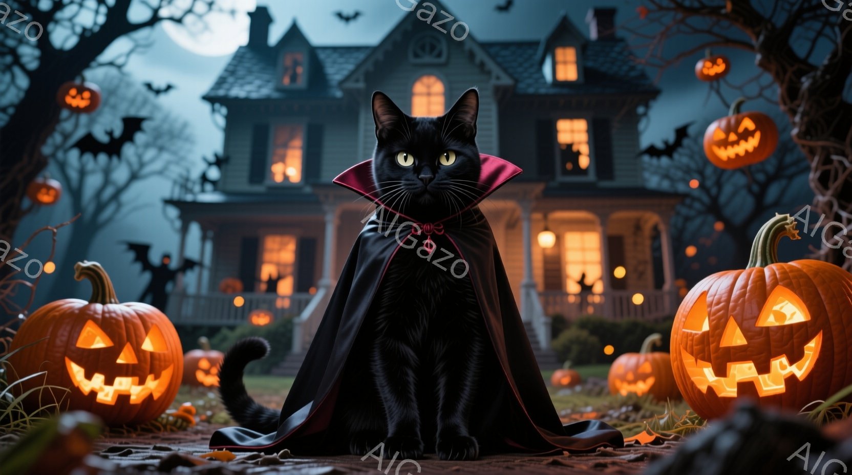 黒猫が赤い縁取りの黒いマントを羽織って座っており、鋭い眼光で正面を見据えています。背景には、ハロウィーンの装飾であるジャック・オ・ランタンが複数並び、薄暗い光を放つ古い屋敷がそびえ立っています。全体的に不気味でありながらも遊び心のある、ハロウィーンの夜の雰囲気が漂っています。