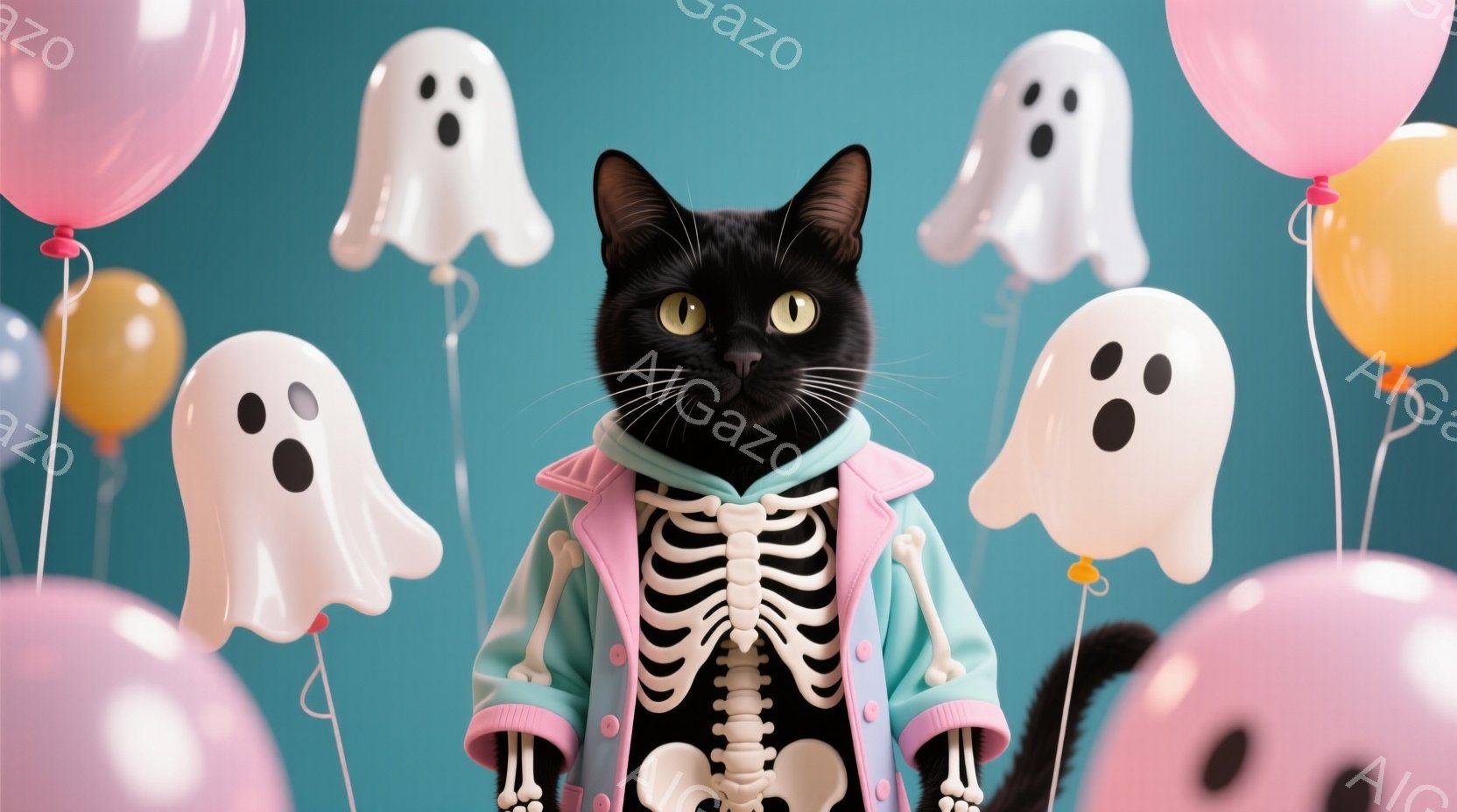 黒猫がハロウィーン風の衣装を着ています。ターコイズ色の骨格模様のトップスと、ピンク色のフリル付き襟が特徴的です。背景には、ピンク、オレンジ、水色の風船と、可愛らしいお化けの形をした風船が浮かんでおり、お祝いムード満載です。