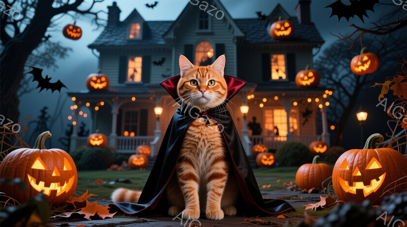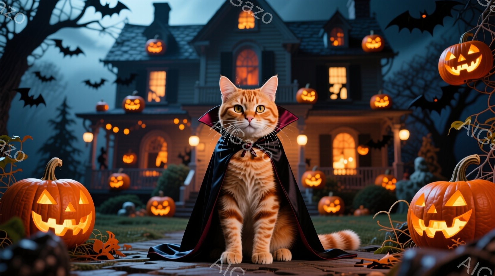 オレンジ色のトラ猫が、黒いケープと赤い蝶ネクタイを身につけ、自信に満ちた表情で正面を向いています。背景には、ハロウィーンのランタンで飾られた薄暗い屋敷と、夜空に舞うコウモリ、そしてハロウィーンカボチャが配置されています。全体的に、ハロウィーンの夜の神秘的で陽気な雰囲気を醸し出しています。