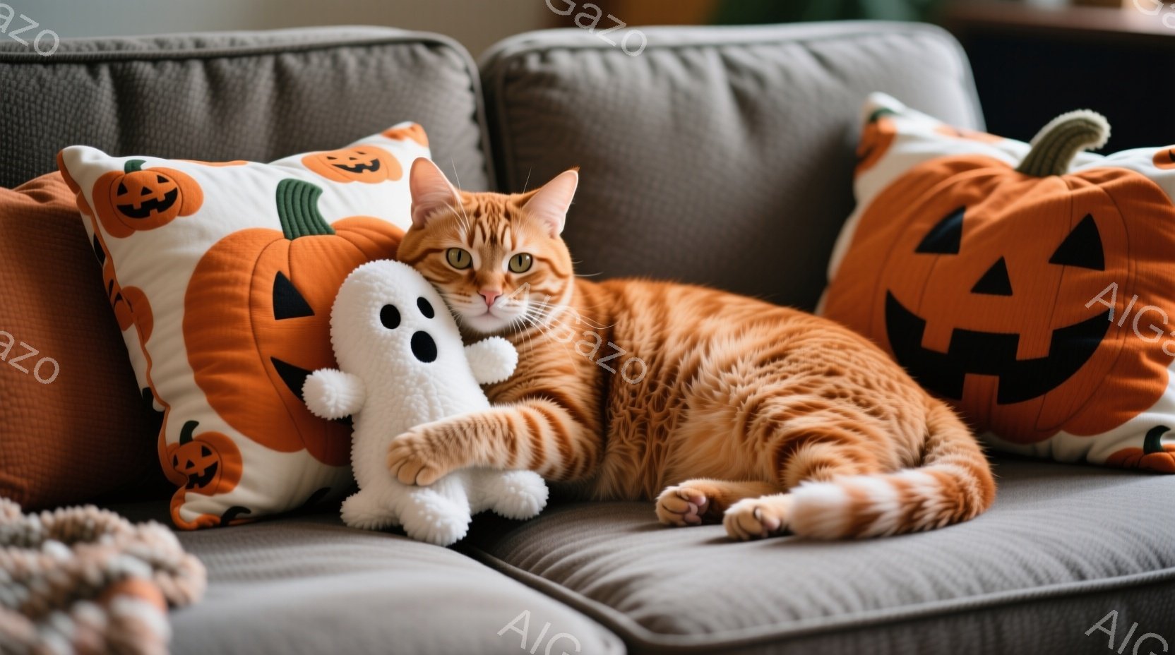 オレンジ色のハロウィーンのバケツの中に、縞模様のオレンジ色の子猫が可愛らしく座っています。バケツには「Trick or Treat」と書かれており、周りには様々な色のキャンディーやハロウィーンのジャック・オー・ランタンが置かれています。全体的に明るく、お祭り気分で、可愛らしい雰囲気を醸し出しています。