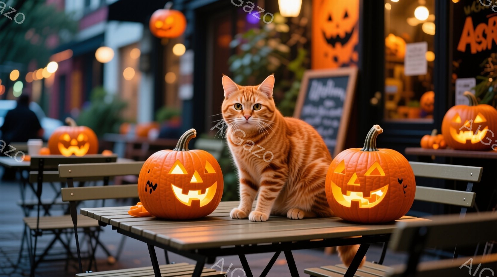 オレンジ色のトラ猫が、ハロウィーンの飾り付けがされた屋外のカフェのテーブルに座っています。テーブルの上には、点灯したジャック・オ・ランタンが2つ置かれており、背景には他のジャック・オ・ランタンやカフェの装飾が見えます。カフェは夜間であり、暖かく、お祭り気分に満ちた雰囲気が漂っています。