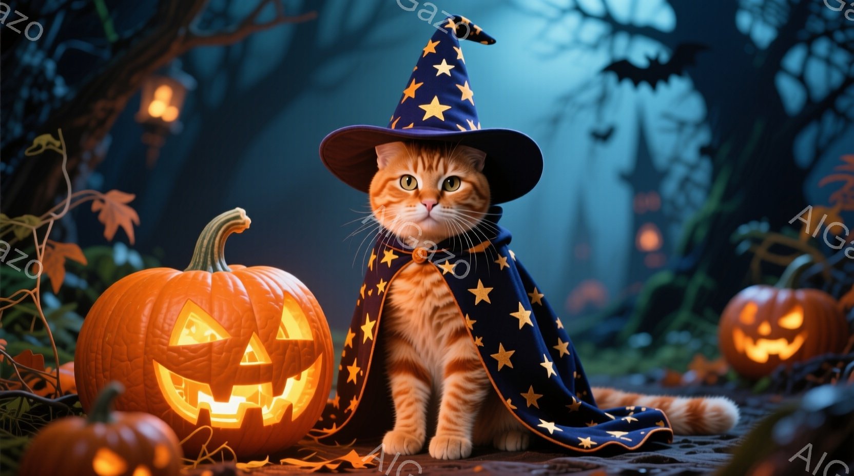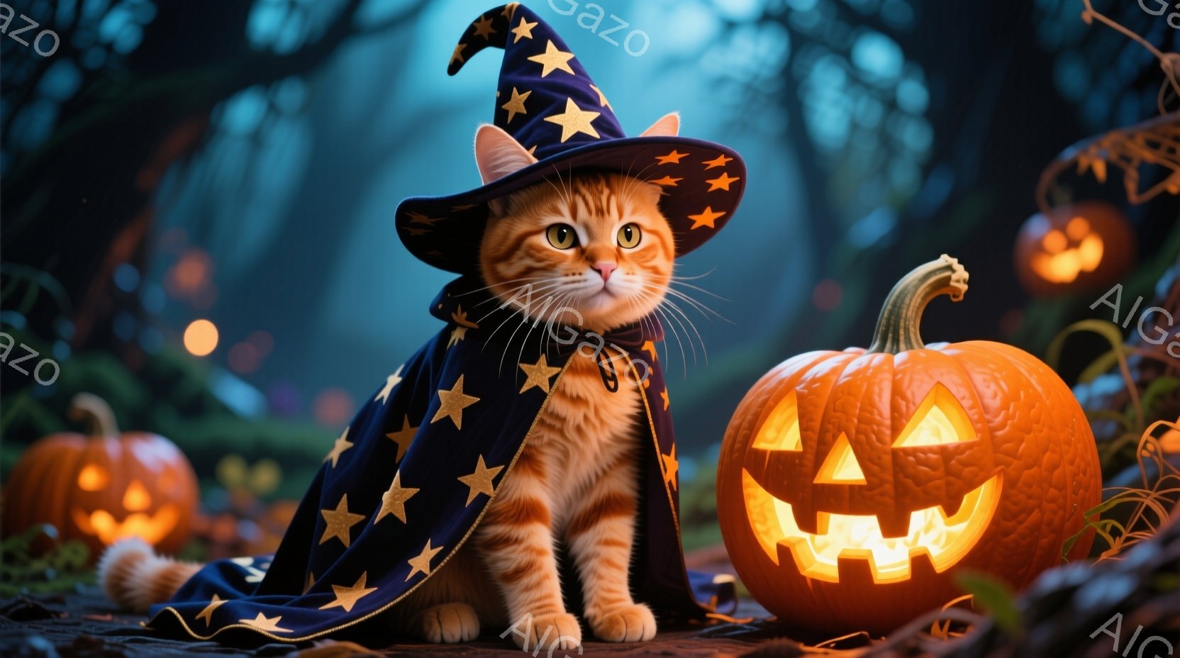 オレンジ色の毛並みを持つ子猫が、星が刺繍された濃い青色のマントと、先が尖った魔女帽子を身に着けて座っています。その表情は自信に満ち溢れ、ハロウィーンの準備万端です。背景には、光るジャック・オー・ランタンが並び、暗い森が広がっており、神秘的で少し不気味な雰囲気を醸し出しています。