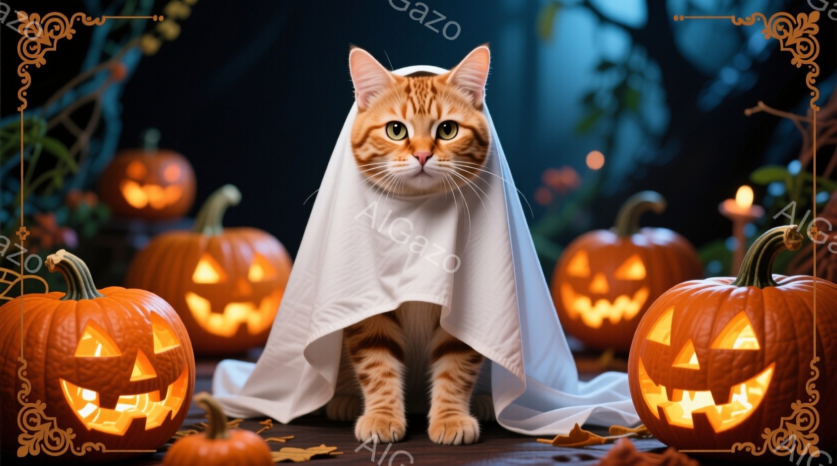 この無料AI生成画像「明るいオレンジ色の縞模様の猫が、ハロウィーンの装飾がされたベッドの上でゆったりと横たわっています。背景には、カボチャの形をしたクッションや小さなカボチャの置物があり、ベッドのヘッドボードには暖色のフェアリーライトが飾られています。全体的に、暖かく、居心地の良い、ハロウィーンの雰囲気を感じさせる写真です。」は、2025年10月25日に作成されました。 サイズは 1664×928px の高解像度で、商用利用も可能なフリー素材として提供しています。