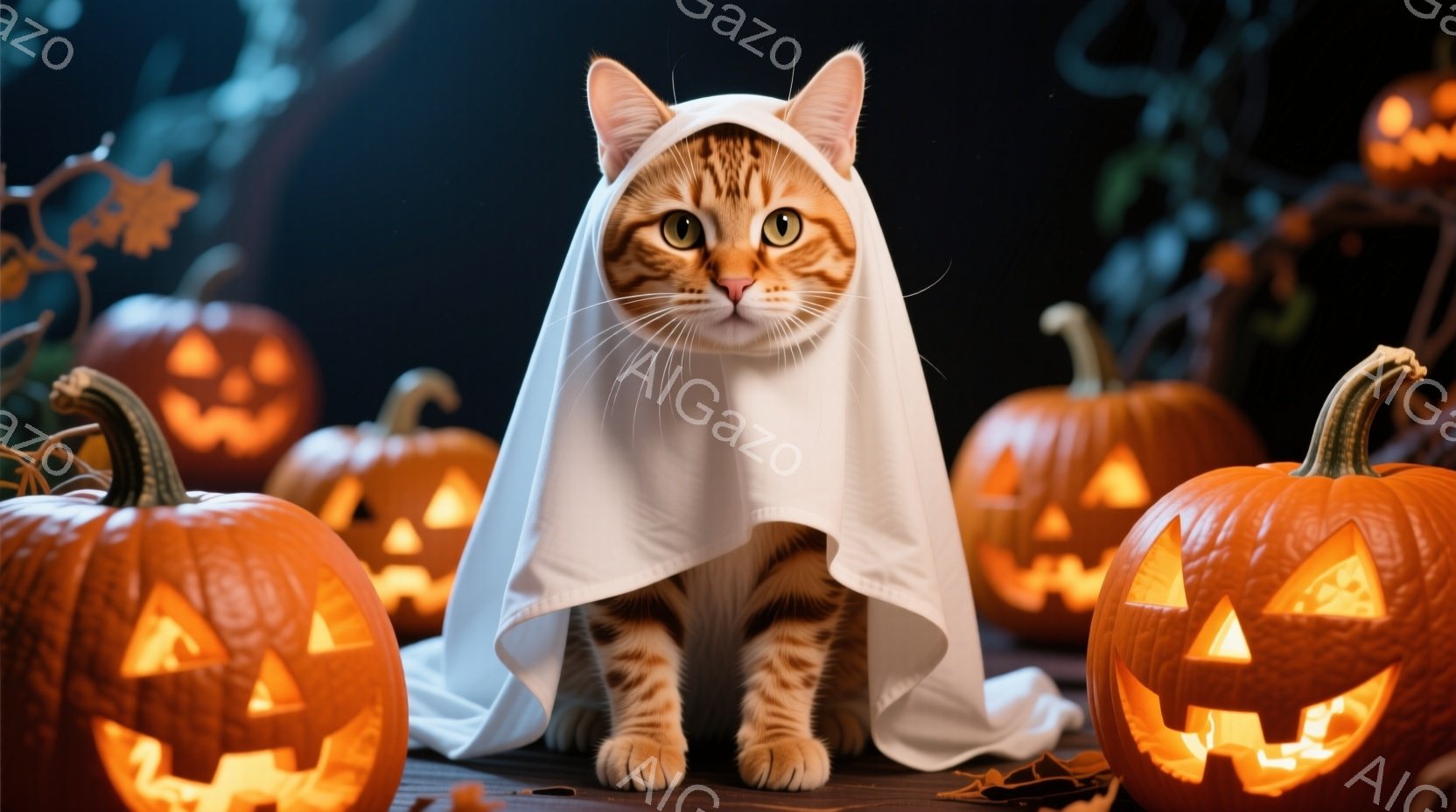 オレンジ色のトラ猫が白い布をマントのように羽織って座っています。猫は正面をまっすぐ見ており、好奇心と少しの警戒心を湛えた表情をしています。背景にはハロウィーンのランタンとしてくり抜かれた様々な大きさのオレンジ色のカボチャが配置され、暗闇の中で暖かく光っています。