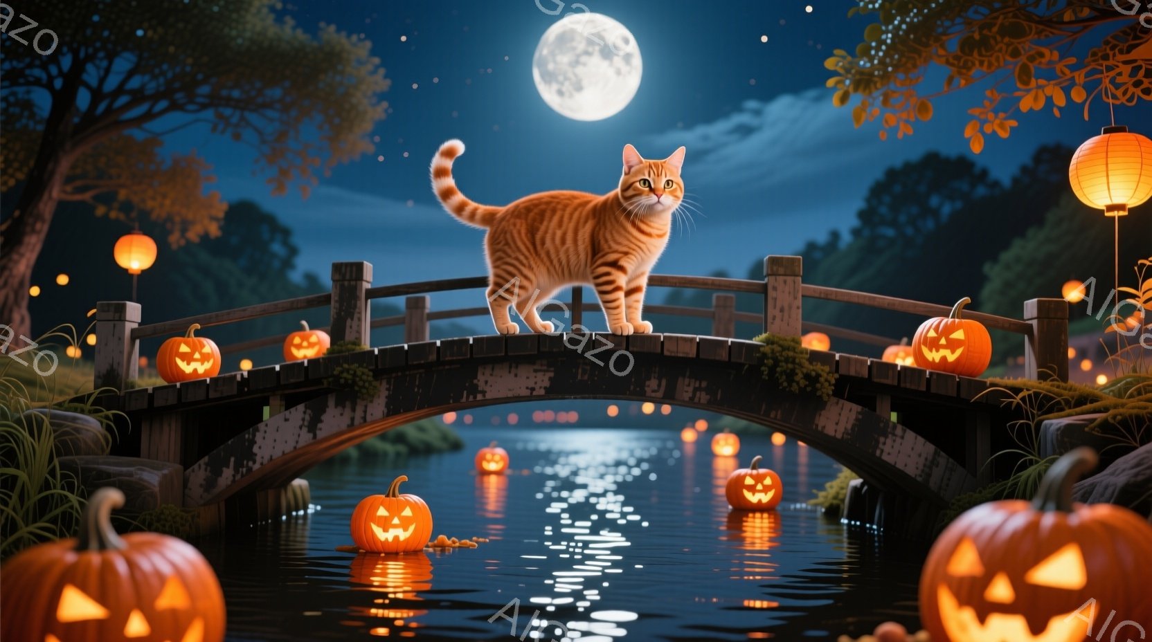 満月の夜、小さな木橋の上をオレンジ色のトラ猫が堂々と歩いている。橋の欄干や水面には、ジャック・オー・ランタンが浮かび、ハロウィーンの雰囲気を醸し出している。背景には暗い緑の木々が並び、水面に映る月光が幻想的な光景を作り出している。