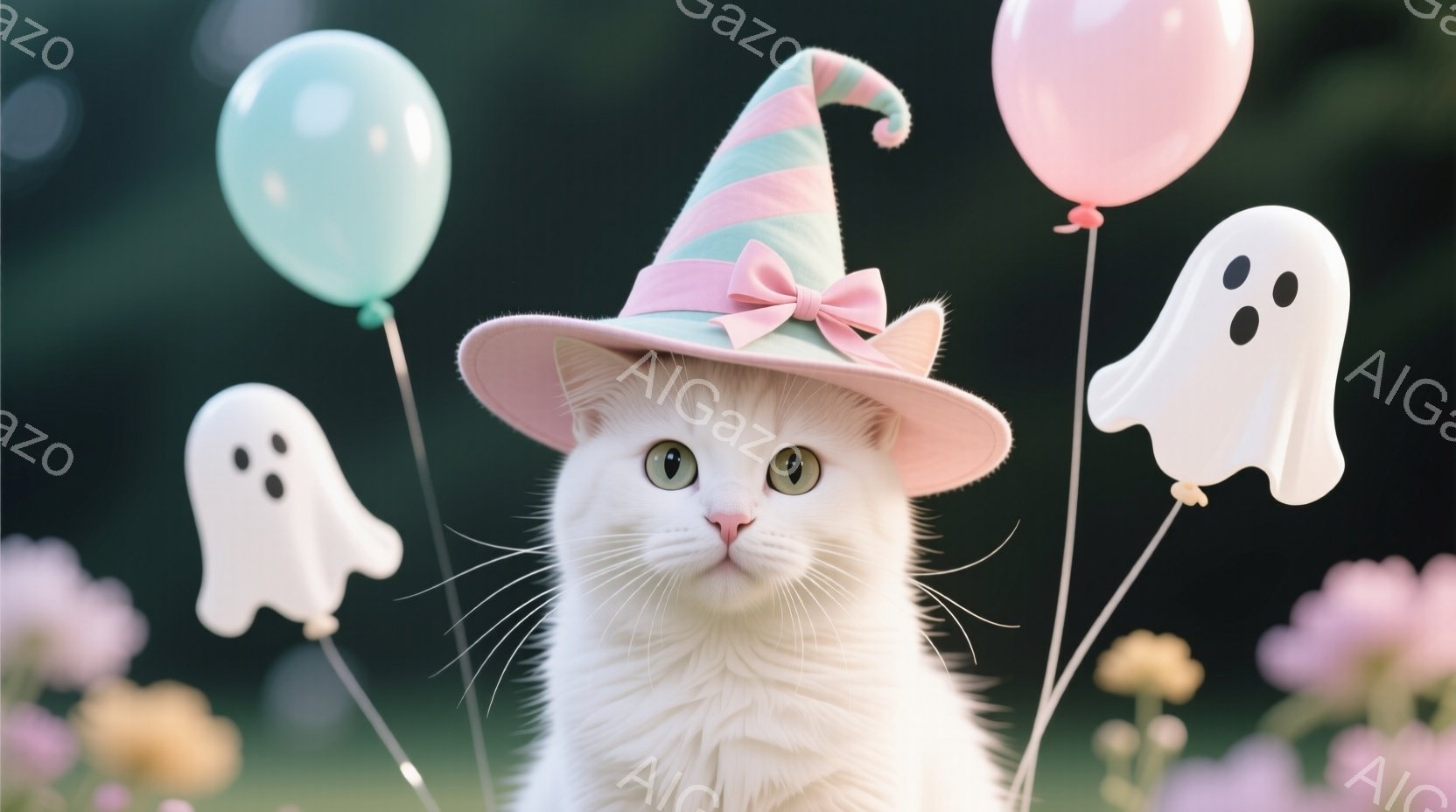白い猫が、ピンクと紫色のハロウィーン風帽子をかぶって正面を見つめています。猫の周りには、幽霊のような形をしたピンクの風船が浮かんでおり、背景にはぼやけたピンクと紫の花々が広がっています。全体的に、柔らかいパステルカラーと可愛らしい猫の表情が、温かく幻想的な雰囲気を醸し出しています。