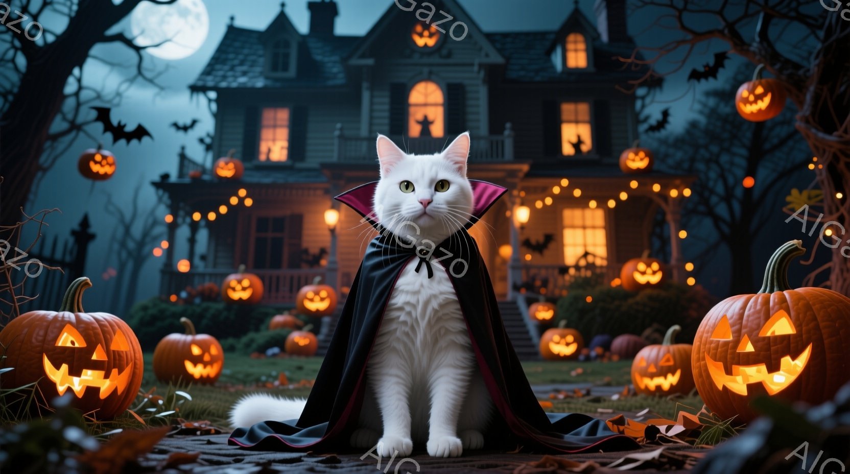 白い猫が黒いケープと赤いリボンタイを身につけ、正面を見つめて座っています。背景には、ハロウィーンのランタンで飾られた薄暗い屋敷と、木の枝が広がる夜空が広がっています。全体的に、不気味でありながらも可愛らしいハロウィーンの雰囲気が漂っています。