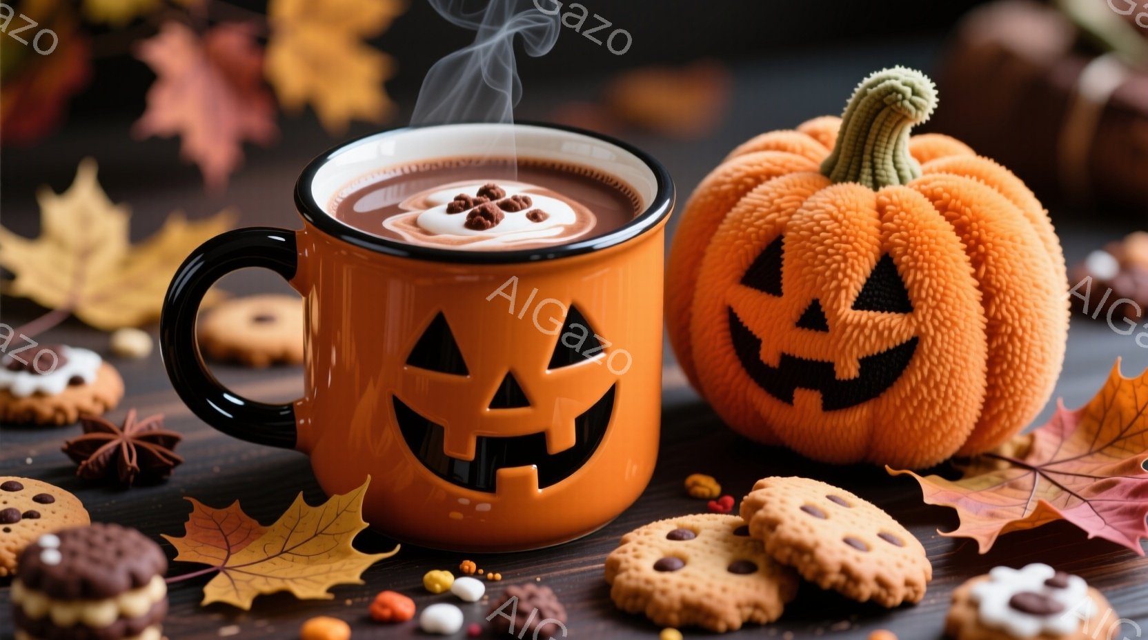 この無料AI生成画像「白い猫が、ハロウィーンのクッキー型パンプキンに鼻を近づけています。背景には、小さなキャンディーや、別のパンプキンの置物が散らばっており、青緑色の背景がハロウィーンの雰囲気を引き立てています。猫は好奇心と少しの警戒心を表した表情で、可愛らしい雰囲気を醸し出しています。」は、2025年10月25日に作成されました。 サイズは 1664×928px の高解像度で、商用利用も可能なフリー素材として提供しています。