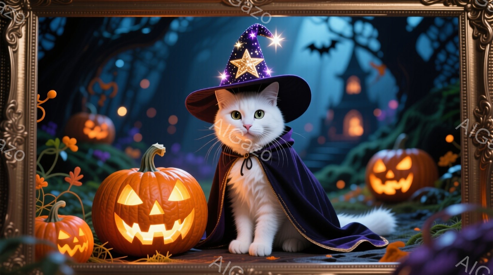 白い猫が、星が飾られた魔法使いの帽子と、金色の装飾が施された黒いマントを身に着けて座っています。周囲には、ジャック・オー・ランタンが灯っており、薄暗い森の中、木々の間から星が輝く夜の背景が広がっています。 全体的に、ハロウィーンの神秘的でかわいらしい雰囲気が漂っています。