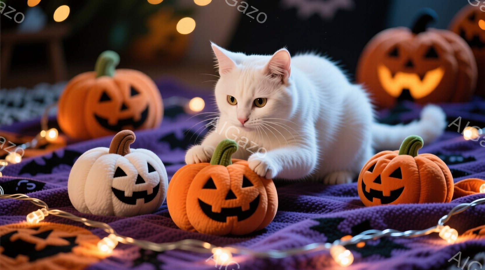 白い猫がハロウィーンの小さなカボチャの置物たちの間で遊び心いっぱいに前足を伸ばしています。背景には、紫色の布とオレンジ色のカボチャのパターンが描かれ、暖かい光のストリングライトがハロウィーンの雰囲気を盛り上げています。全体的に、遊び心があり、お祝いムードにあふれた、温かいハロウィーンのシーンです。