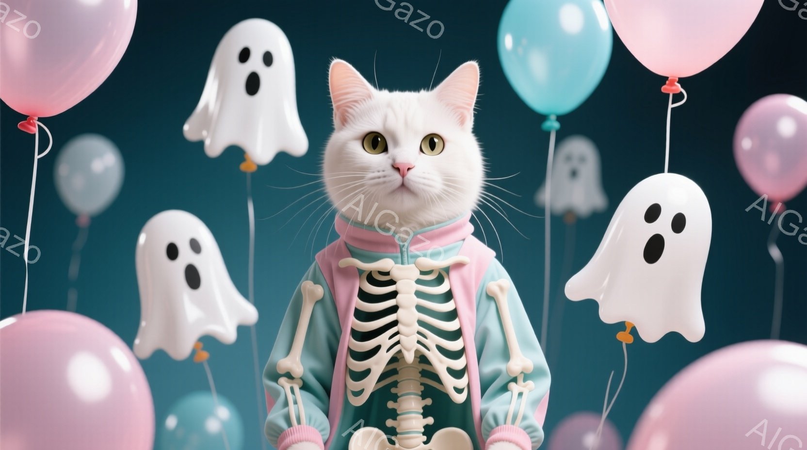 白い猫がハロウィーン風の服装で、ピンク色のパーカーに骨格模様が描かれています。猫は正面を向き、丸い目と少し微笑んでいるような表情で、可愛らしい印象を与えます。背景には、パステルカラーの風船と、ハロウィーンらしいお化けが浮かんでおり、お祝いムードを演出しています。