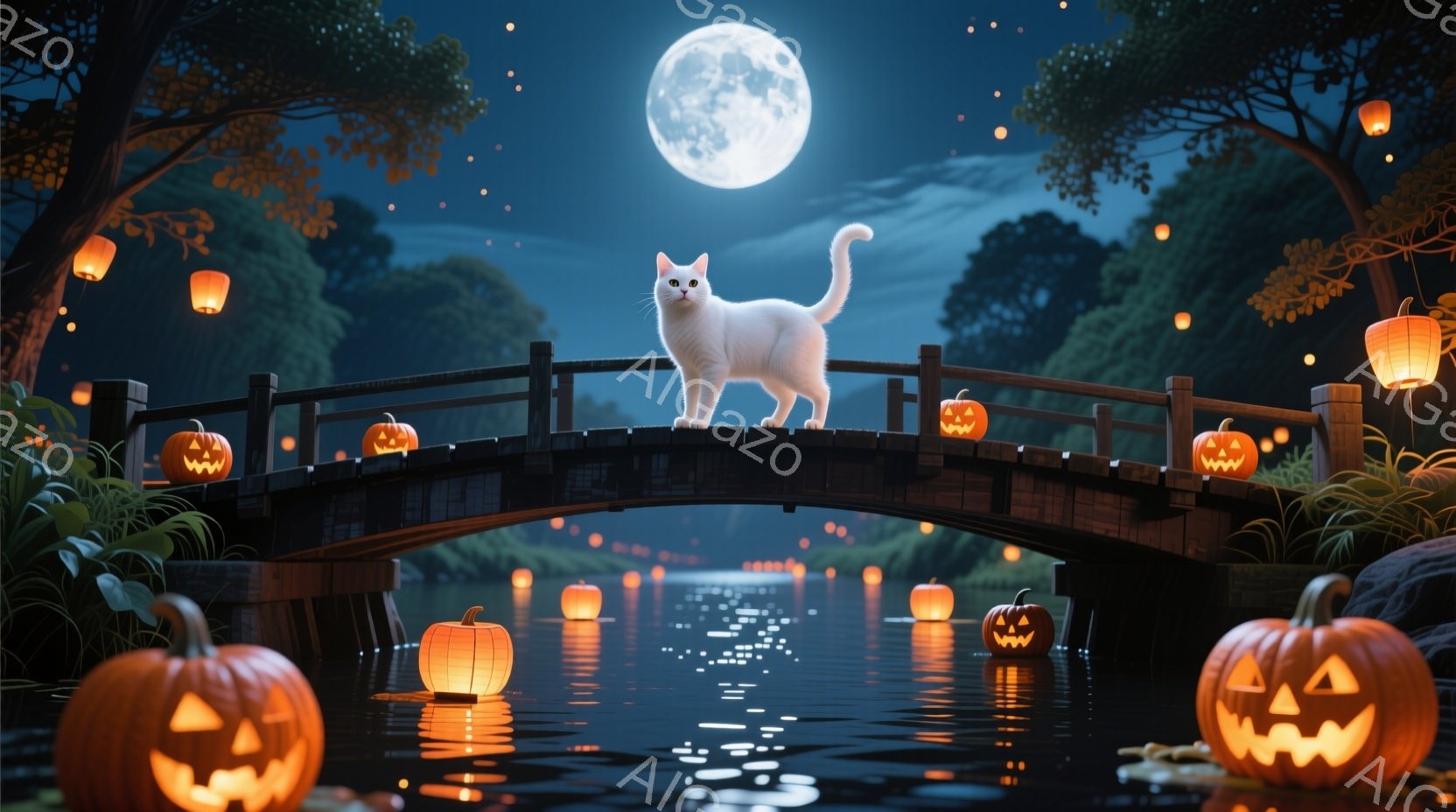 白い猫が、丸い背中を高く弓状にして、小さな木製の橋の上に立っている。暗い水面には、たくさんのジャック・オ・ランタンが浮かび、橋の欄干にも置かれ、月明かりの下で不気味な光を放っている。背景は暗い森で、秋の夜空には明るい満月が輝き、全体的にハロウィーンの神秘的な雰囲気を醸し出している。