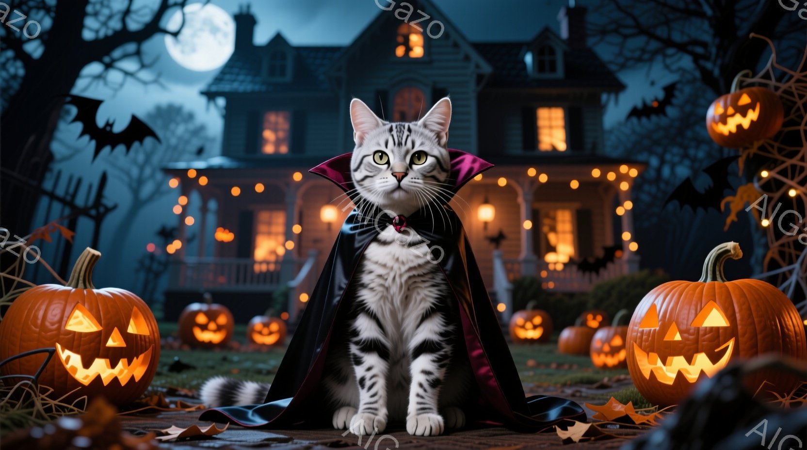 白と灰色の毛並みの猫が、黒いマントと吸血鬼風の襟巻きを身につけて座っています。背景には、ハロウィーンの飾り付けがされた家が聳え立ち、庭にはジャック・オー・ランタンが並べられ、秋の落ち葉が散らばっています。満月が輝き、暗い空にはコウモリが舞い、全体的にハロウィーンの夜の不気味で楽しい雰囲気を醸し出しています。