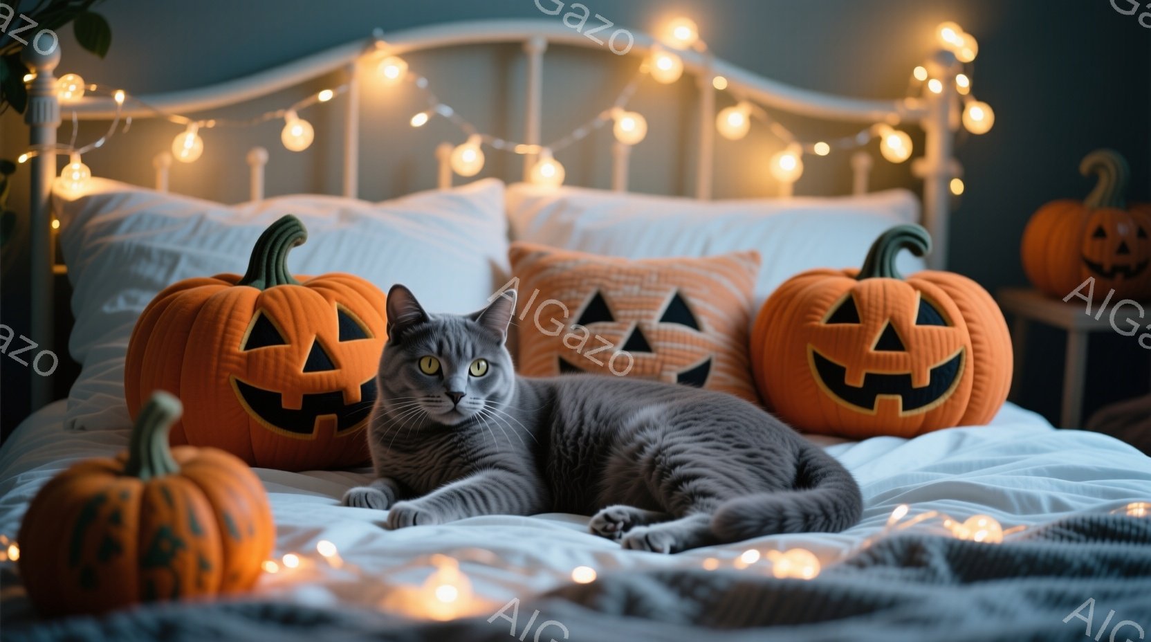 灰色の猫がベッドに横たわり、ハロウィーンの装飾であるオレンジ色のジャック・オー・ランタンの枕に囲まれています。猫はリラックスした表情でカメラを見つめており、ベッドの上には明るいストリングライトが飾られています。全体的に、暖かく心地よいハロウィーンの雰囲気が漂う、秋らしいベッドルームのシーンです。