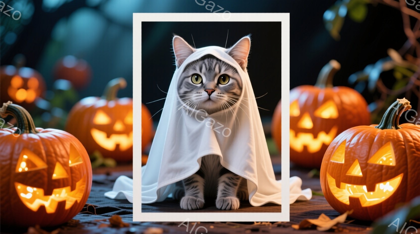 この無料AI生成画像「灰色の猫が白いベッドに横たわっており、周りにはハロウィーンのオレンジ色のジャック・オー・ランタンのクッションと置物が散りばめられています。ベッドの背景には、小さなオレンジ色の光が点在するフェンスのような装飾があり、全体的に暖かく、季節感あふれる雰囲気です。猫はリラックスした表情で、秋のハロウィーンの雰囲気に包まれています。」は、2025年10月25日に作成されました。 サイズは 1664×928px の高解像度で、商用利用も可能なフリー素材として提供しています。
