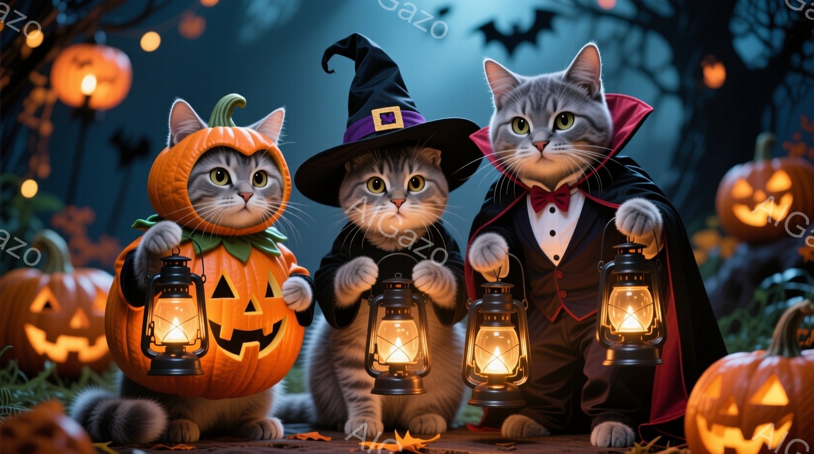 ハロウィーンの衣装を着た3匹の猫が、それぞれ提灯を持っています。左の猫はカボチャの衣装を着ており、中央の猫は魔女の帽子とローブを着て、右の猫は吸血鬼の衣装を着ています。背景にはオレンジ色のジャック・オー・ランタンが散らばり、暗い森の雰囲気の中で、お祝いのハロウィーンの夜を演出しています。