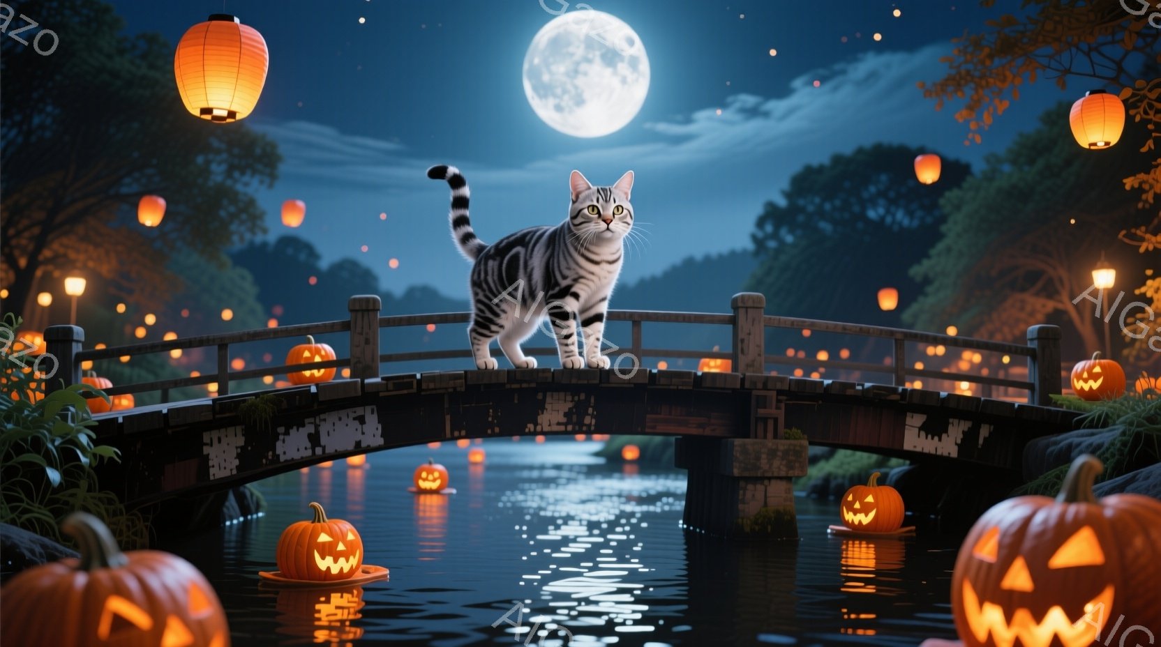 夜の川にかかる木製の橋の上に、縞模様の猫が凛々と立っている。橋や川の周りには、不気味な光を放つジャック・オー・ランタンが浮かび、満月の光が水面に反射し幻想的な雰囲気を醸し出している。背景には暗い木々が広がり、ハロウィンの夜の静けさと神秘性が感じられる。