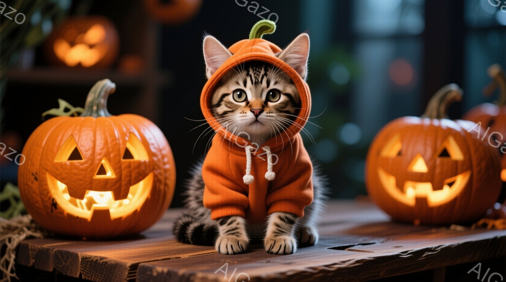 茶色の縞模様の猫が、ハロウィーンらしいオレンジ色のパーカーを着て、木製のテーブルの上に座っています。猫は前足を揃えて座り、少しこちらを見て、穏やかな表情をしています。背景には、さまざまな大きさのジャックオーランタンが並び、秋の夜の温かく楽しい雰囲気を醸し出しています。