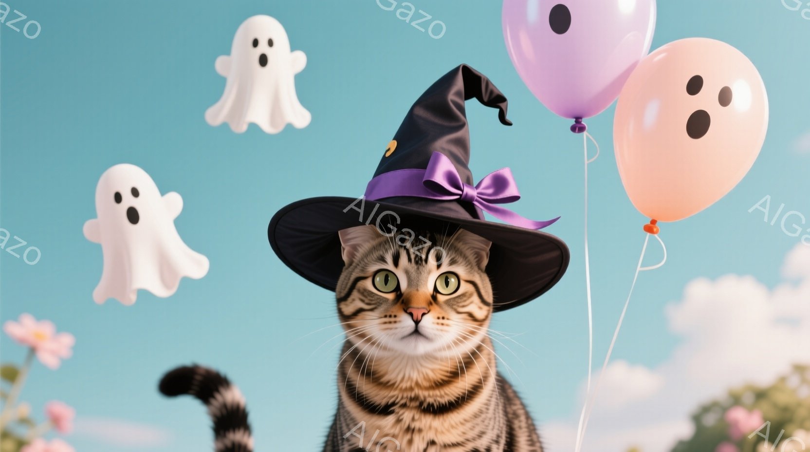 茶色の縞模様の猫が、ハロウィーンらしい黒い帽子をかぶって正面を見つめています。背景には、パステルカラーの風船や可愛らしい幽霊の形をした飾り、そして緑豊かな草原が広がっており、穏やかで楽しい雰囲気を醸し出しています。猫の表情は少しいたずらっぽく、全体的に可愛らしいハロウィーンの光景です。