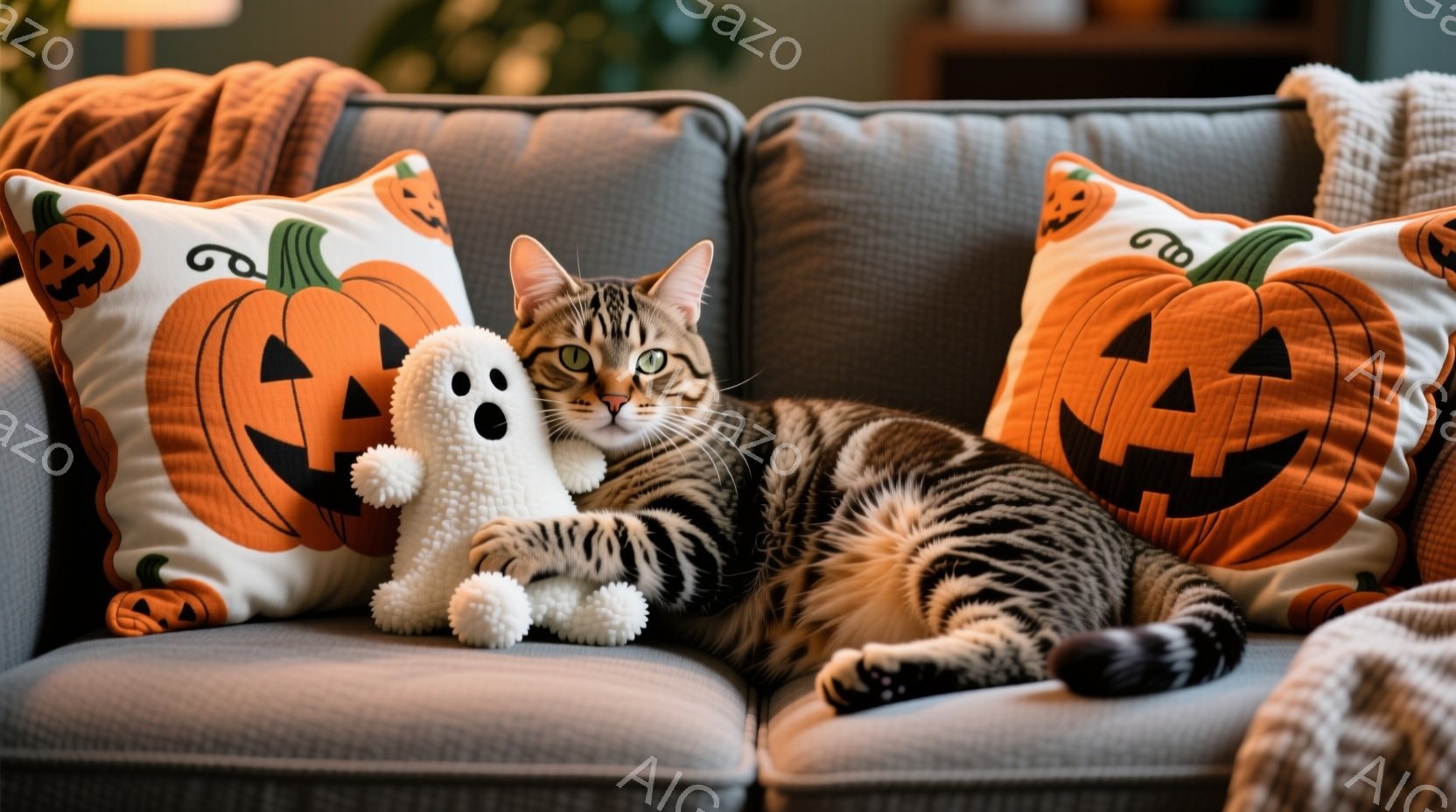 灰色のソファに縞模様の猫が横たわっており、隣には白い幽霊のぬいぐるみがあります。猫はリラックスした様子で、前足を伸ばし、顔は穏やかで落ち着いています。背景には、ハロウィーンをテーマにしたオレンジ色のカボチャ柄のクッションが並び、温かく、居心地の良い雰囲気を醸し出しています。