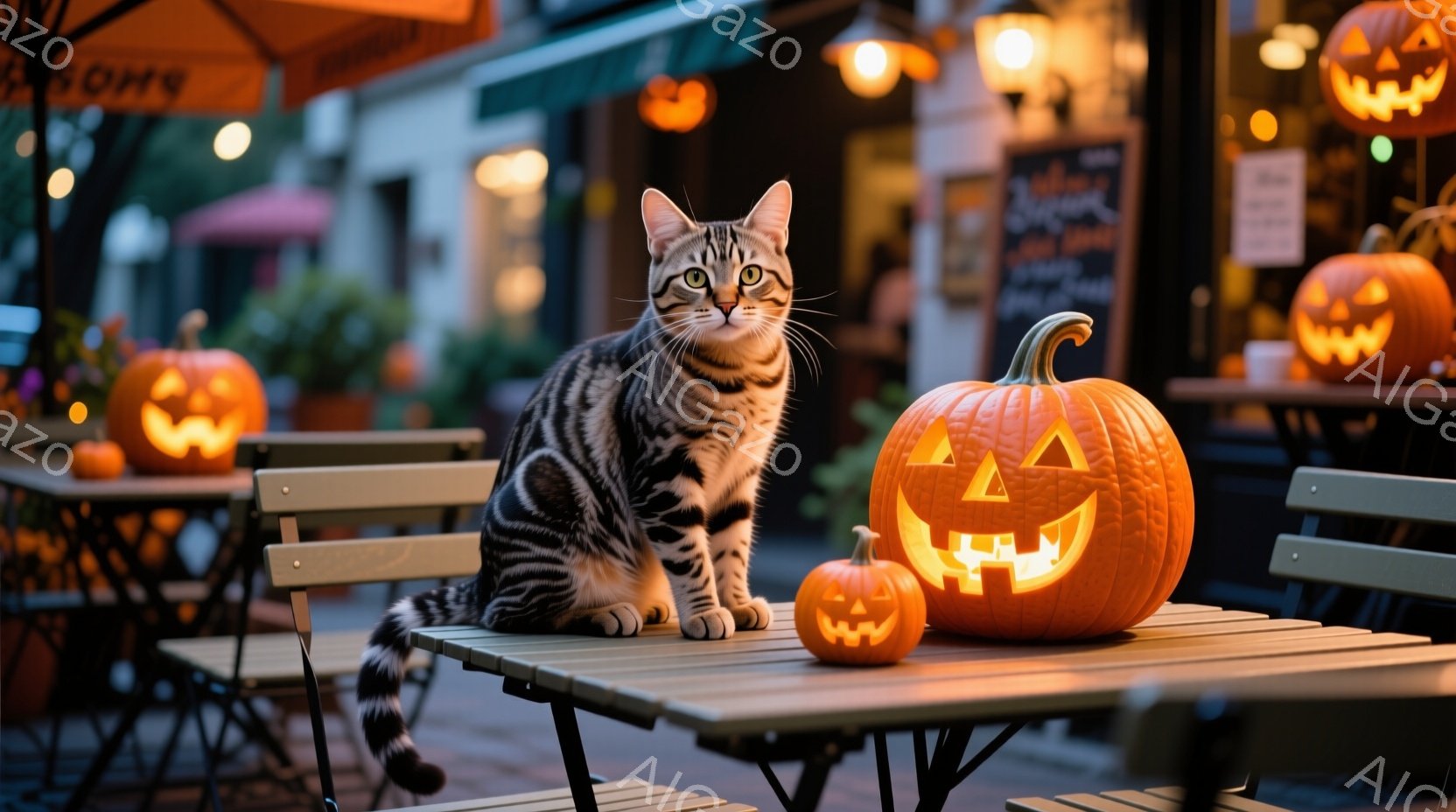 屋外のカフェのテーブルに、縞模様の猫が座っています。周囲には様々な大きさのジャック・オ・ランタンが置かれ、ハロウィーンの雰囲気を醸し出しています。背景にはぼやけたカフェの建物と、薄暗い夜の風景が広がっており、温かく幻想的な雰囲気を演出しています。