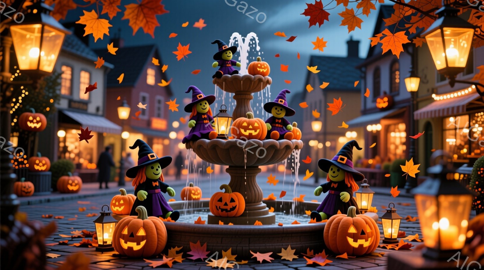 縞模様の猫がハロウィーンの魔女帽子をかぶって正面を見つめている。背景には、お化けの飾りと、オレンジ、紫、ピンクの風船が浮かび、秋らしい花々が添えられている。全体的に、陽気で愛らしいハロウィーンの雰囲気が漂っている。