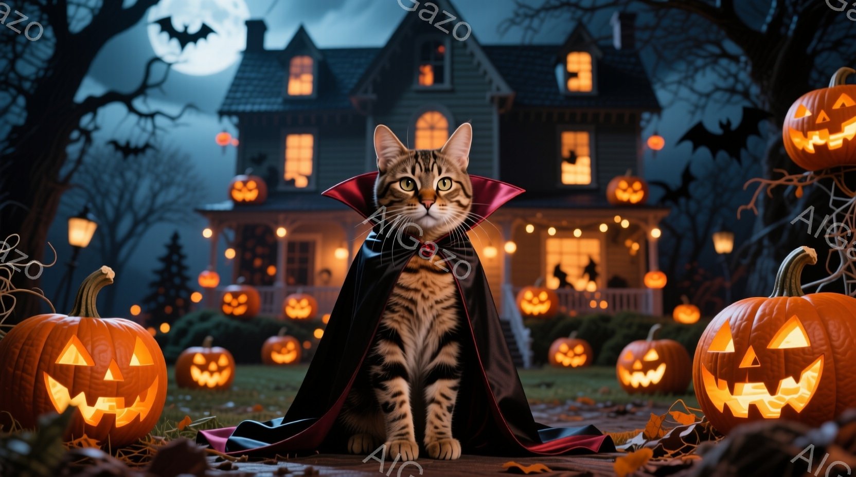 ドラキュラ風の黒いマントを羽織った縞模様の猫が正面を向いて座っています。背景には、ジャック・オー・ランタンで飾られた、不気味な雰囲気の屋敷と、夜空を飛ぶコウモリが見え、ハロウィーンの夜の不気味な雰囲気です。暖色の明かりが、不気味な雰囲気の中に温かさを添えています。