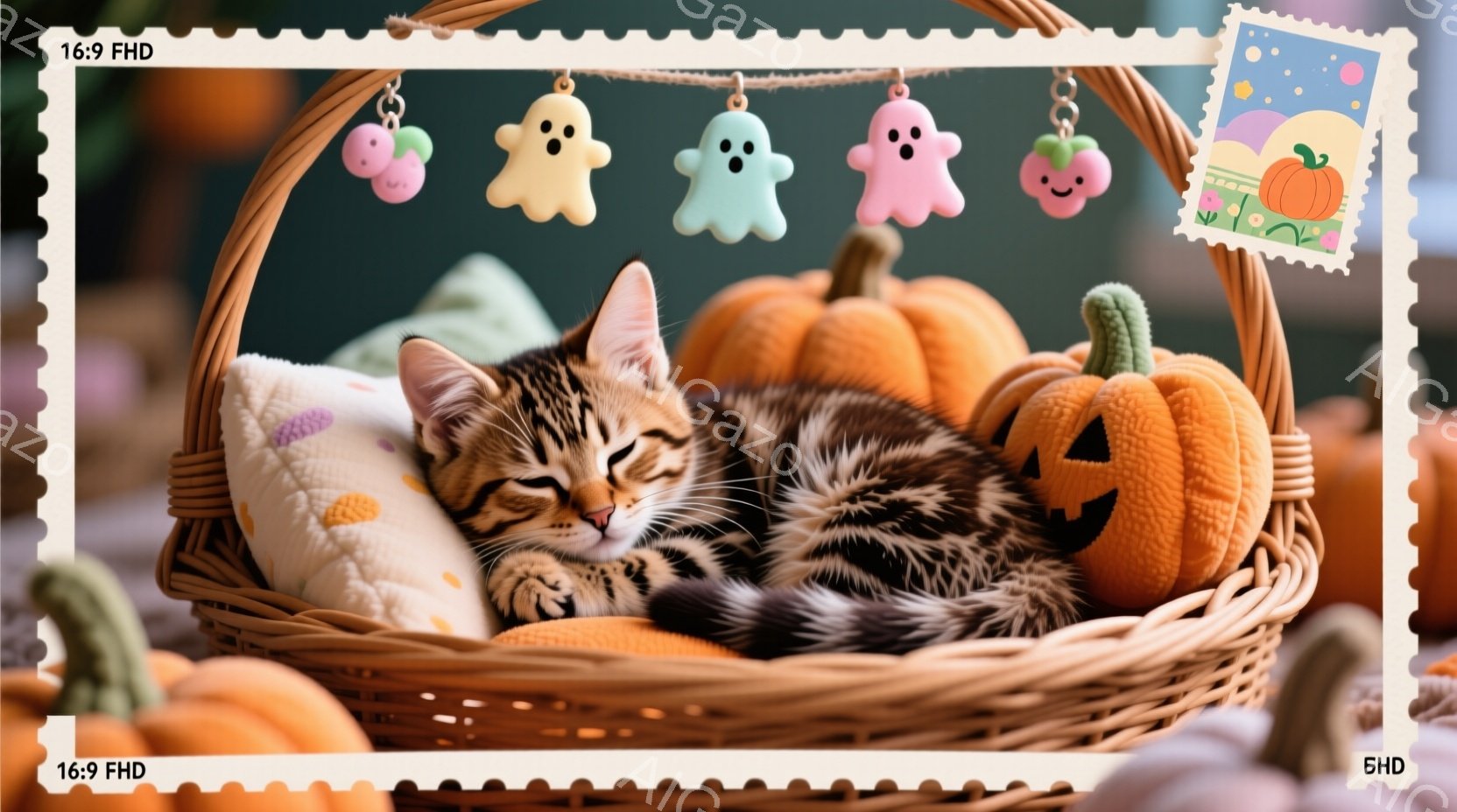 この無料AI生成画像「縞模様の猫が、赤い襟とリボンがついた黒いマントを羽織り、ハロウィーンの夜に座っています。背景には、ジャック・オ・ランタンで飾られた不気味な屋敷と、暗い空に浮かぶ満月、そしてシルエットのコウモリが見え、不気味な雰囲気を醸し出しています。落ち葉が散らばった地面は、秋の夜のハロウィーンパーティーを予感させます。」は、2025年10月25日に作成されました。 サイズは 1664×928px の高解像度で、商用利用も可能なフリー素材として提供しています。