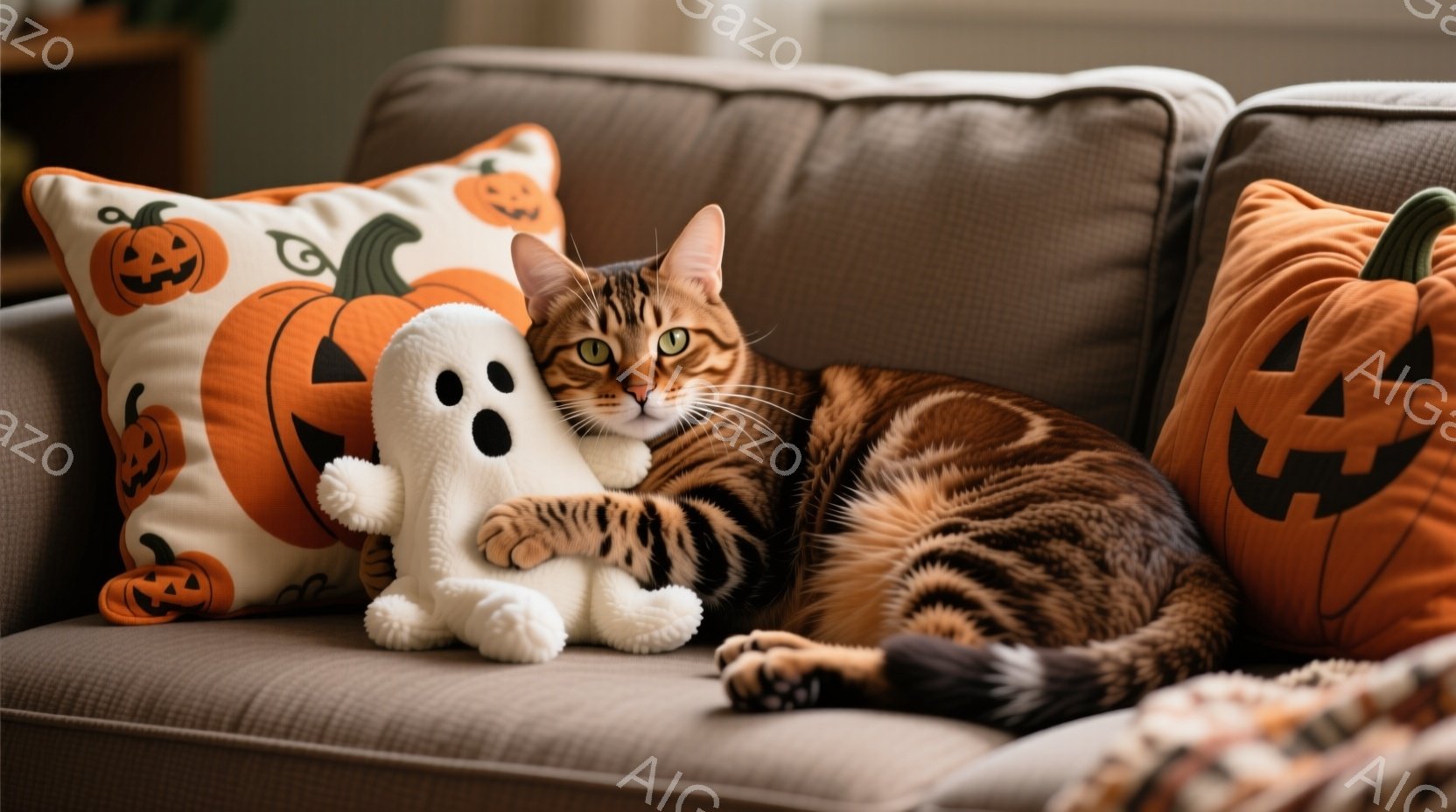 カトリックスクールの教会の場内にあるインテリアを描写するものではなく、猫とその飼い主が自宅で家庭で過ごしているようなシーンを表しています。 猫は、白と黒の毛色を持ち、左の両手に負けたように寝ています。頭を垂げ、目が半閉じ状態でお茶を入れるような表情をしています。猫は柔らかく、身体の線が乱れているため、散漫に寝ていると印象されます。 その周りには、ハロウィンスタイルの枕カバーやパッリングが散らばっており、背景にはフラメンティアーや炭水化樹脂が含まれているようです。全体の雰囲気は家庭的で、休日の暮らしを描写したものと思われます。