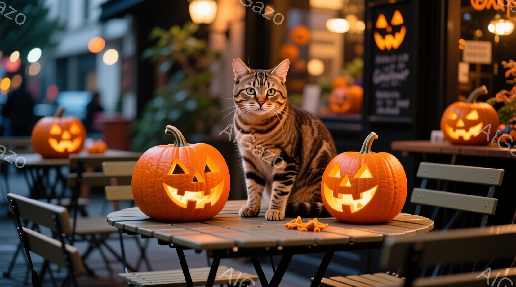 茶色の縞模様の猫が、ハロウィーンの飾りが施された屋外カフェのテーブルに座っている。テーブルの上には、明るく光るジャック・オー・ランタンが2つと、小さなキャンディが置かれており、背景にはぼんやりと店舗や他の装飾が灯っている。全体的に、暖かい光と猫の落ち着いた表情が、ハロウィーンの季節の心地よい雰囲気を醸し出している。