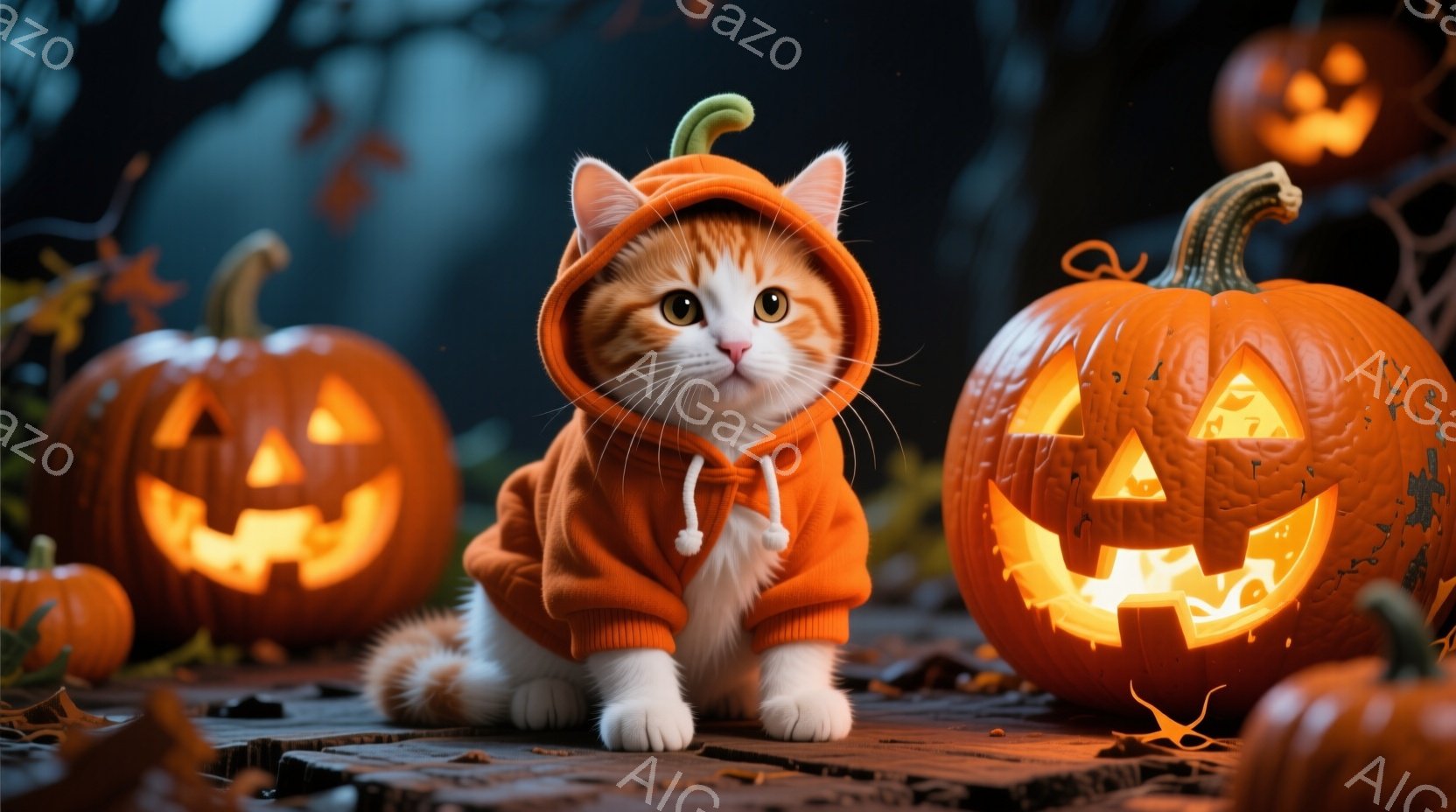 この無料AI生成画像「白とオレンジ色の毛並みの小さな猫が、オレンジ色のパーカーを着て、木製の台の上に座っています。猫は前方をまっすぐ見ており、好奇心と少しの戸惑いが入り混じった表情をしています。背景には、ジャック・オー・ランタンが灯っており、落ち葉が散らばり、ハロウィーンの温かく幻想的な雰囲気を醸し出しています。」は、2025年10月25日に作成されました。 サイズは 1664×928px の高解像度で、商用利用も可能なフリー素材として提供しています。