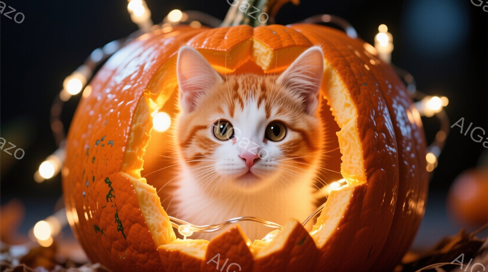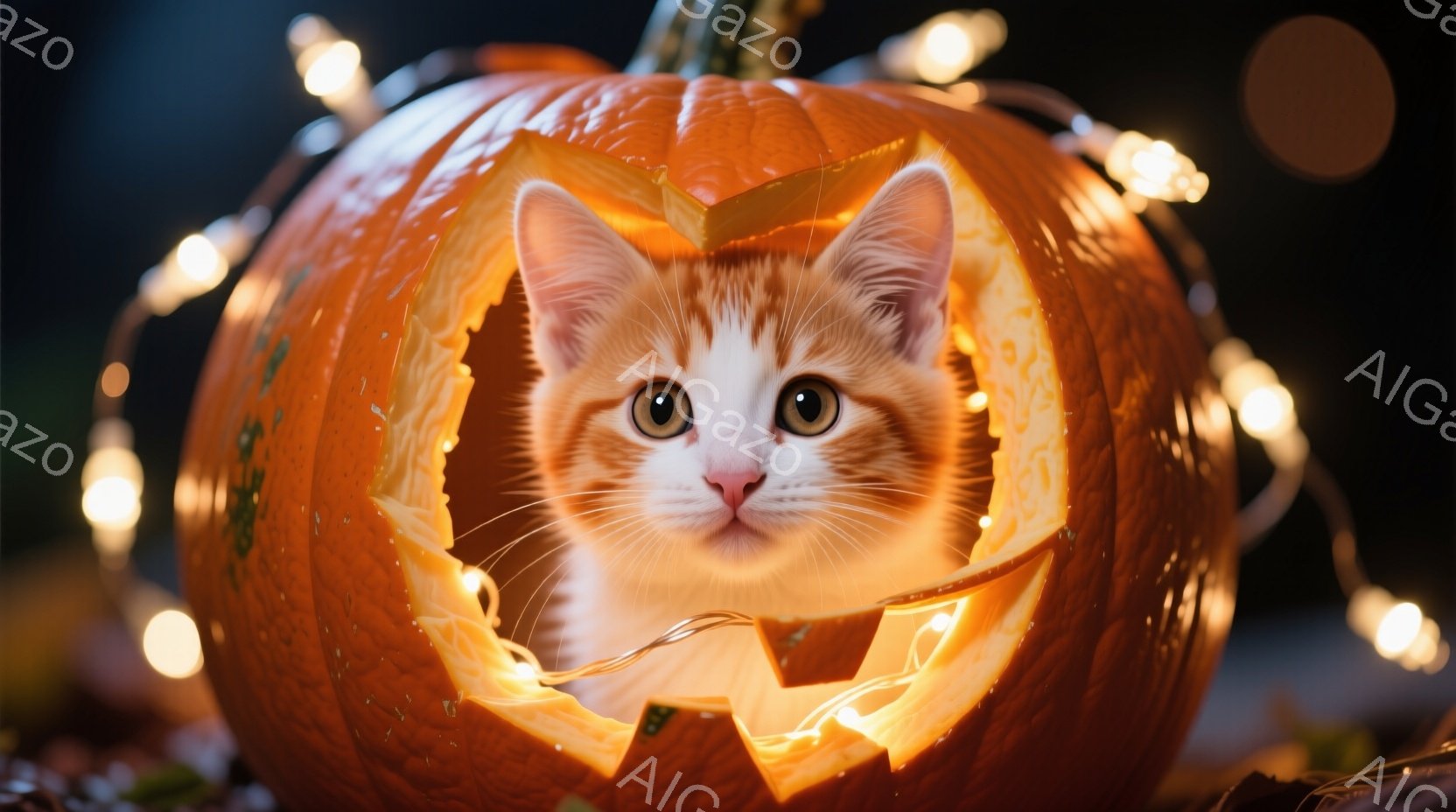 オレンジ色の猫が、ハロウィーンのジャック・オ・ランタンの切り抜きから顔を出しています。猫は明るいオレンジ色の光に照らされ、好奇心と遊び心のある表情でカメラを見ています。背景にはぼやけた光のストリングがあり、お祝いの雰囲気を醸し出しています。