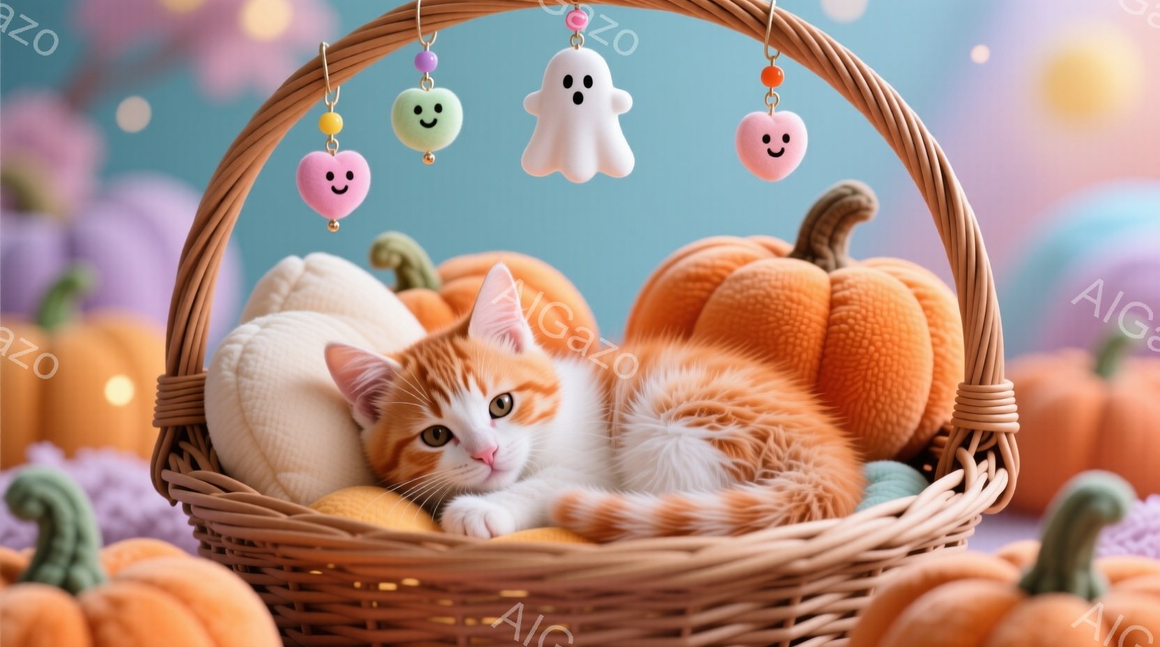 オレンジ色のキティがカボチャで満たされた籐の籠の中で丸まって眠っています。上には、可愛いお化けの飾り付けがぶら下がり、背景にはぼやけた緑色のカボチャが並び、全体的に温かく、秋らしい雰囲気を醸し出しています。キティの表情は穏やかで、リラックスした様子が伝わってきます。