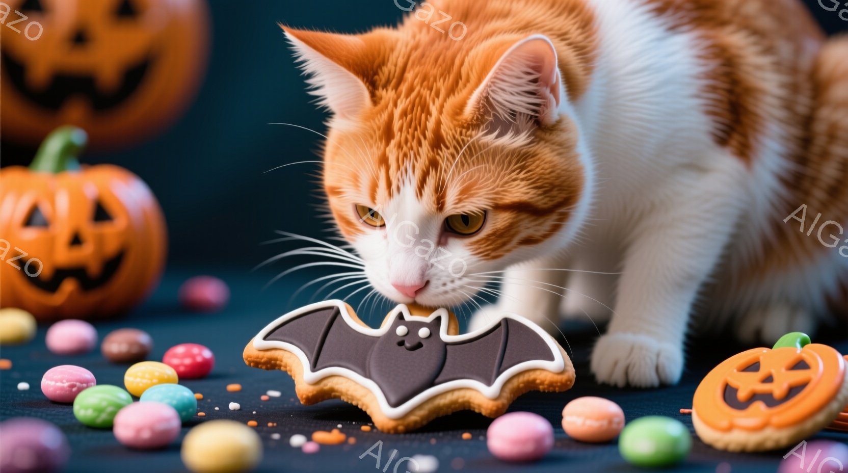 明るいオレンジ色の猫が、ハロウィーンをテーマにしたクッキーにかぶりつこうとしています。クッキーはコウモリの形をしており、背景にはカラフルなキャンディーと小さなハロウィーンの飾りカボチャが散りばめられています。全体的に、暖かく、遊び心のある、お祝いの雰囲気が漂っています。