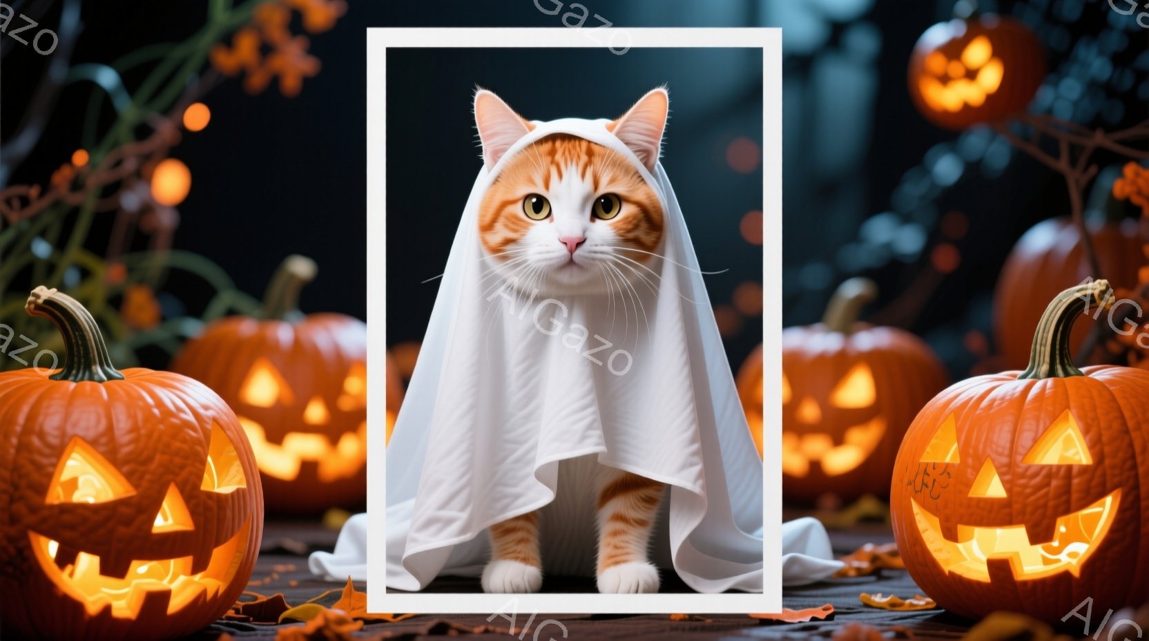 オレンジ色の猫が白い布をまとい、ハロウィーンの装いをしている。猫は正面を見つめ、少し好奇心と控えめな表情を浮かべている。背景には、ジャック・オー・ランタンが配置され、暗い背景と合わせてお祝いの雰囲気を醸し出している。