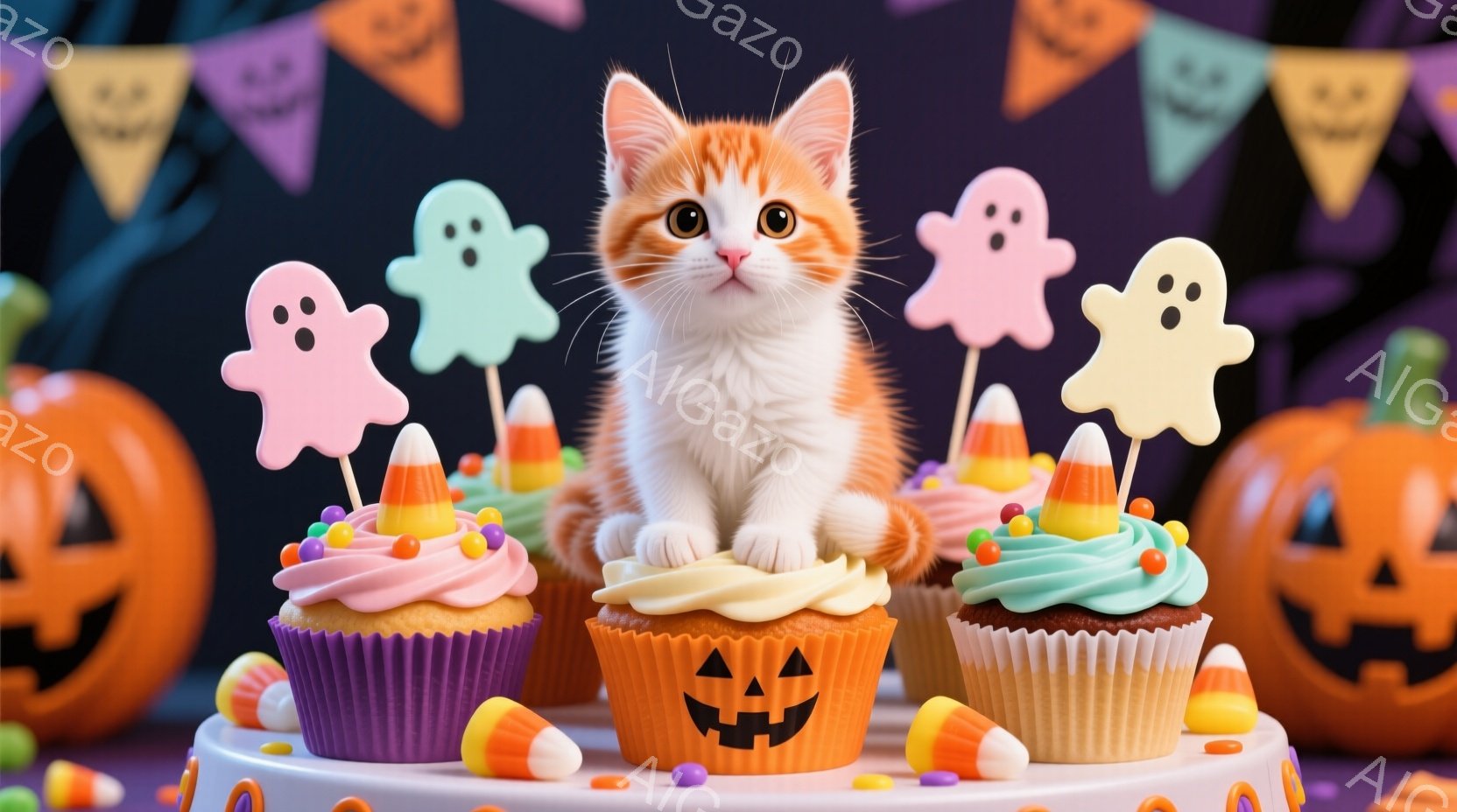 明るい紫色のケーキスタンドに、ハロウィンをテーマにしたカップケーキが並んでいます。その上に、オレンジと白の縞模様のキティが座り、キャンディコーンと幽霊の飾りをつけたカップケーキを見つめています。背景には、ハロウィンのカボチャと旗飾りがあり、お祝いムードを盛り上げています。