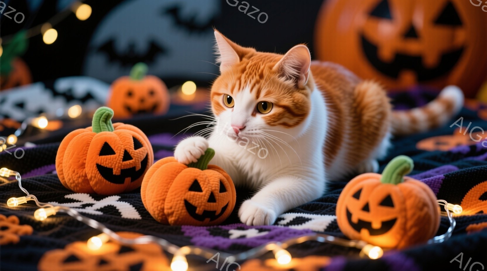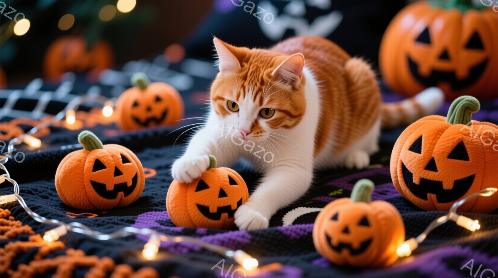 白とオレンジの毛並みを持つ猫が、ハロウィーンの飾りである小さなカボチャのぬいぐるみと紫色の背景に囲まれて横たわっています。猫は前足を伸ばし、カボチャのぬいぐるみに興味津々な表情をしています。背景には、点滅するオレンジ色のライトが散りばめられ、暖かく、遊び心のあるハロウィーンの雰囲気を醸し出しています。