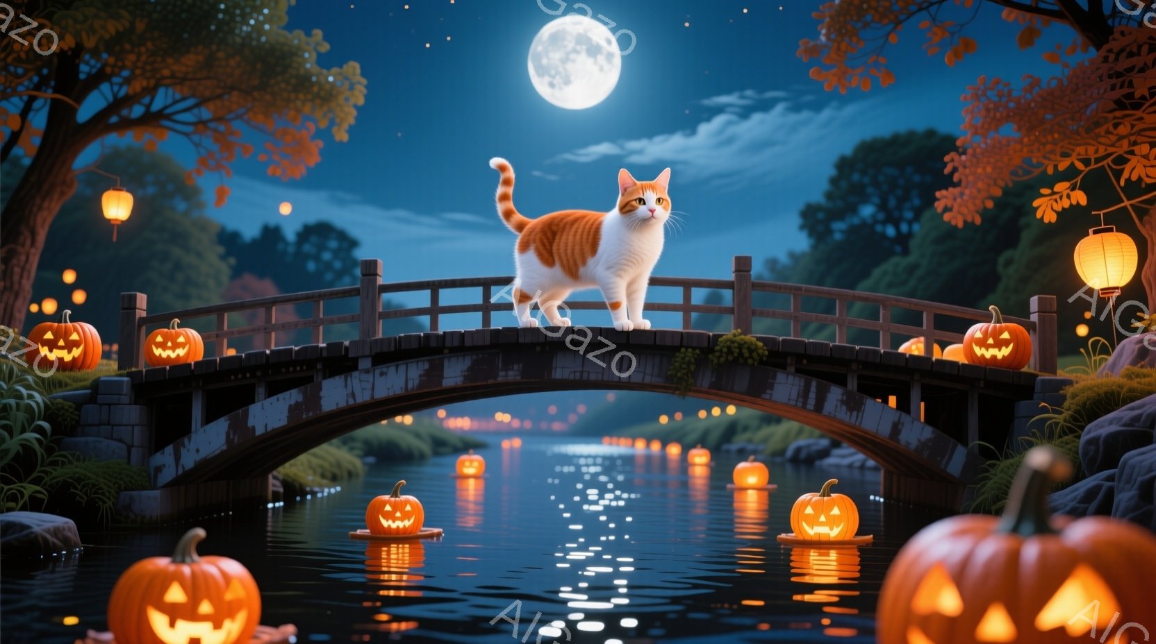 満月の夜、小さな橋の上にオレンジと白の猫が立っています。橋の欄干には様々な大きさのジャック・オー・ランタンが並び、水面にはその光が反射して幻想的な雰囲気を醸し出しています。背景には木々が生い茂り、遠くには建物が見え、ハロウィンの夜の静けさと温かさを感じさせます。