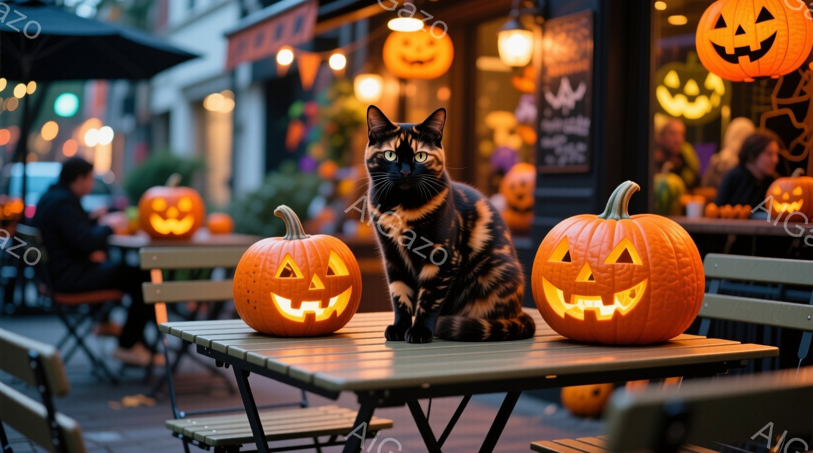 テーブルの上に黒と茶色の模様の猫が座っており、ハロウィーンの小さなカボチャのランタンが並んでいます。背景にはぼやけた建物と、オレンジ色のハロウィーンの装飾が施された通りがあり、夜の雰囲気です。猫は落ち着いた表情で、リラックスして座っています。